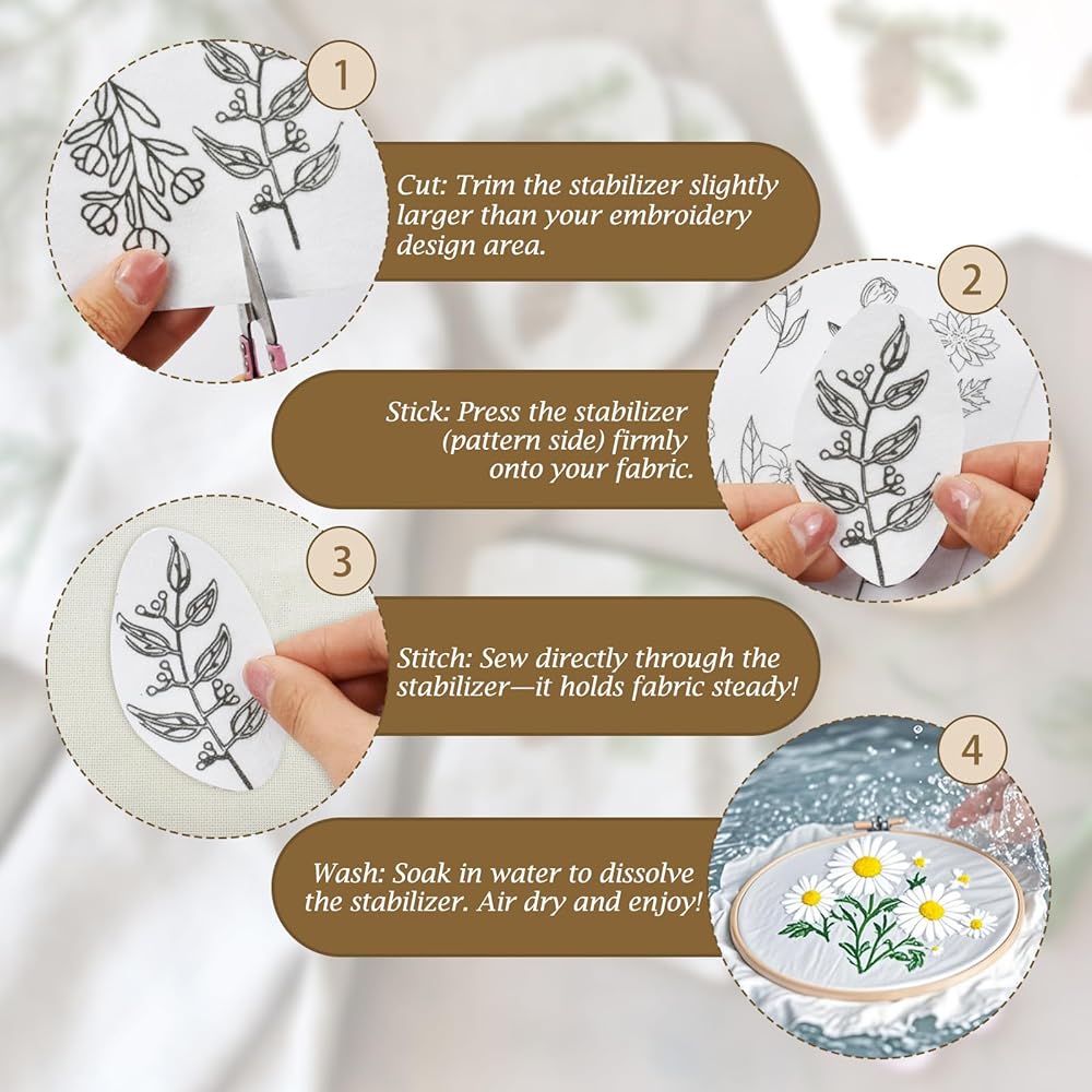 Trusted Material: Lightweight yet durable, prevents fabric puckering for crisp results. Our hand embroidery patterns are made of quality water soluble stabilizers that are easily soluble in water, ensuring that the embroidery project is clean and without residue.