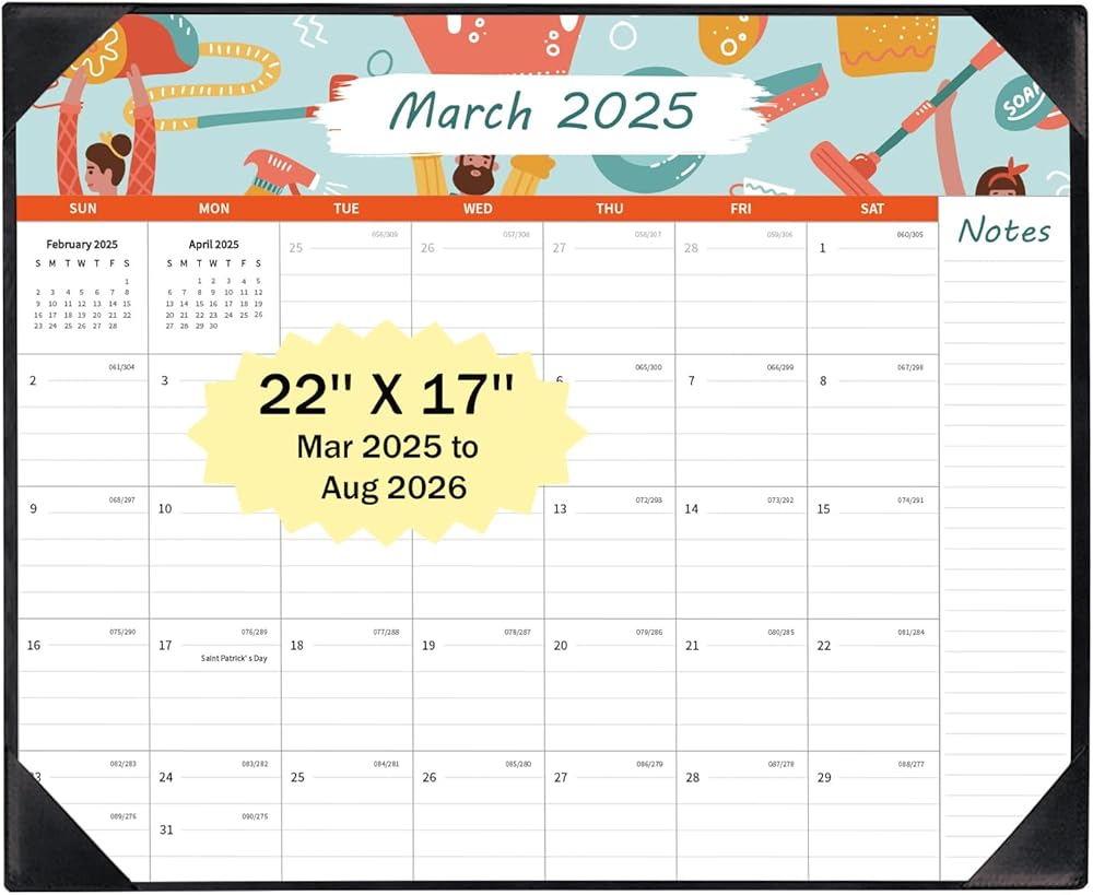 تقويم المكتب الكبير لمدة 18 شهرًا: يغطي التقويم المكتبي لعام 2025 18 شهرًا من مارس 2025 إلى أغسطس 2026. يتمتع تقويمنا 2025 بتقويم مرجعي للعام كامل لتسجيل المهام اليومية والتخطيط المستقبلي. يشمل التقويم 2025 جميع العطلات الأمريكية الرئيسية