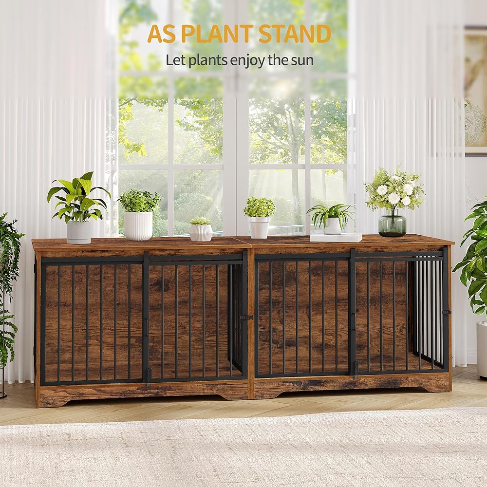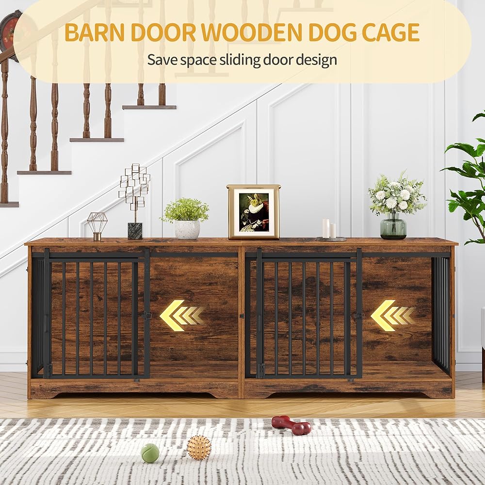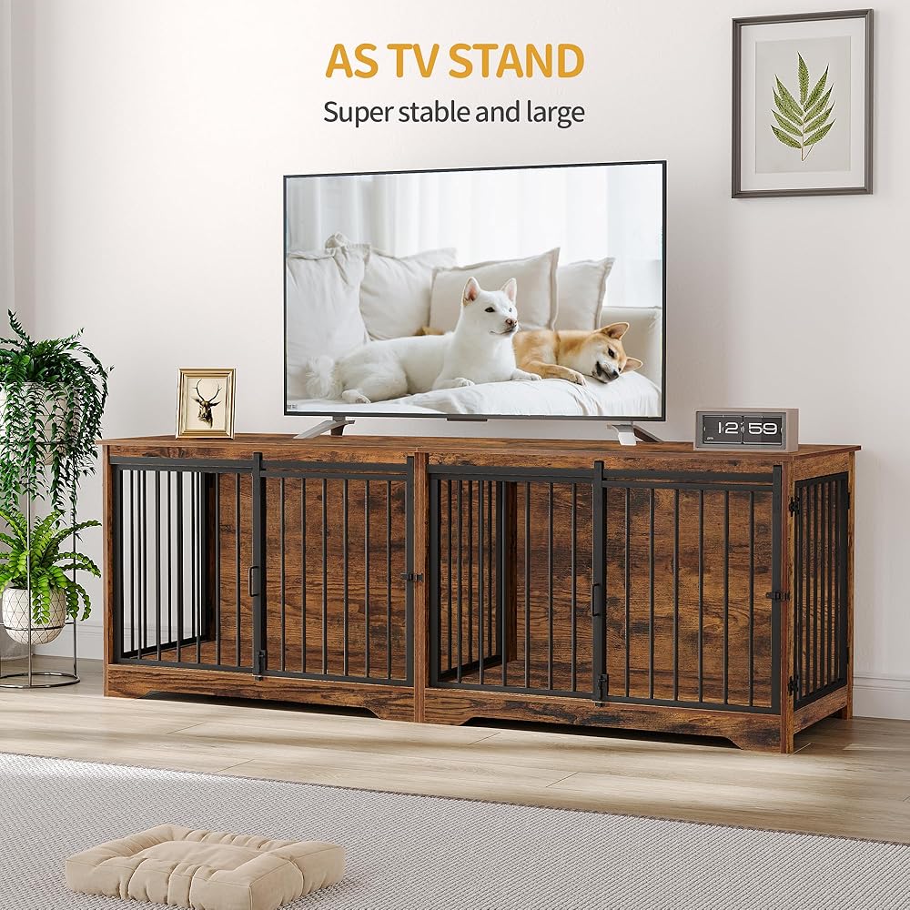 78 بوصة أثاث قفص الكلب ل 2 كلاب ، سلالة كبيرة كبيرة الأثاث قفص الكلب المزدوج ، xxl حامل تلفزيون خشبي سميك ، أثاث بيت الكلب مع مقسم ، طاولة جانبية نهاية ، مكافحة ، بني ريفي ،