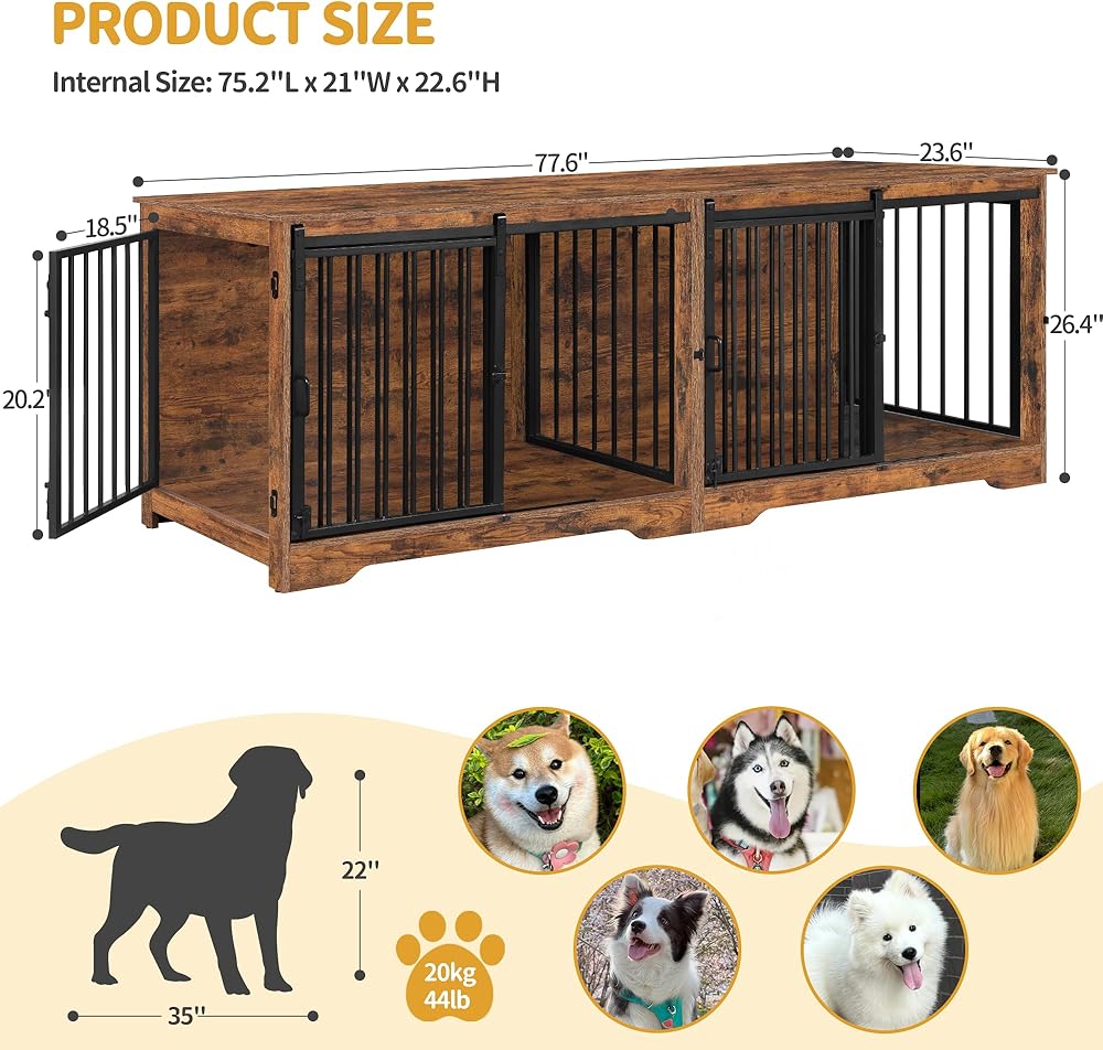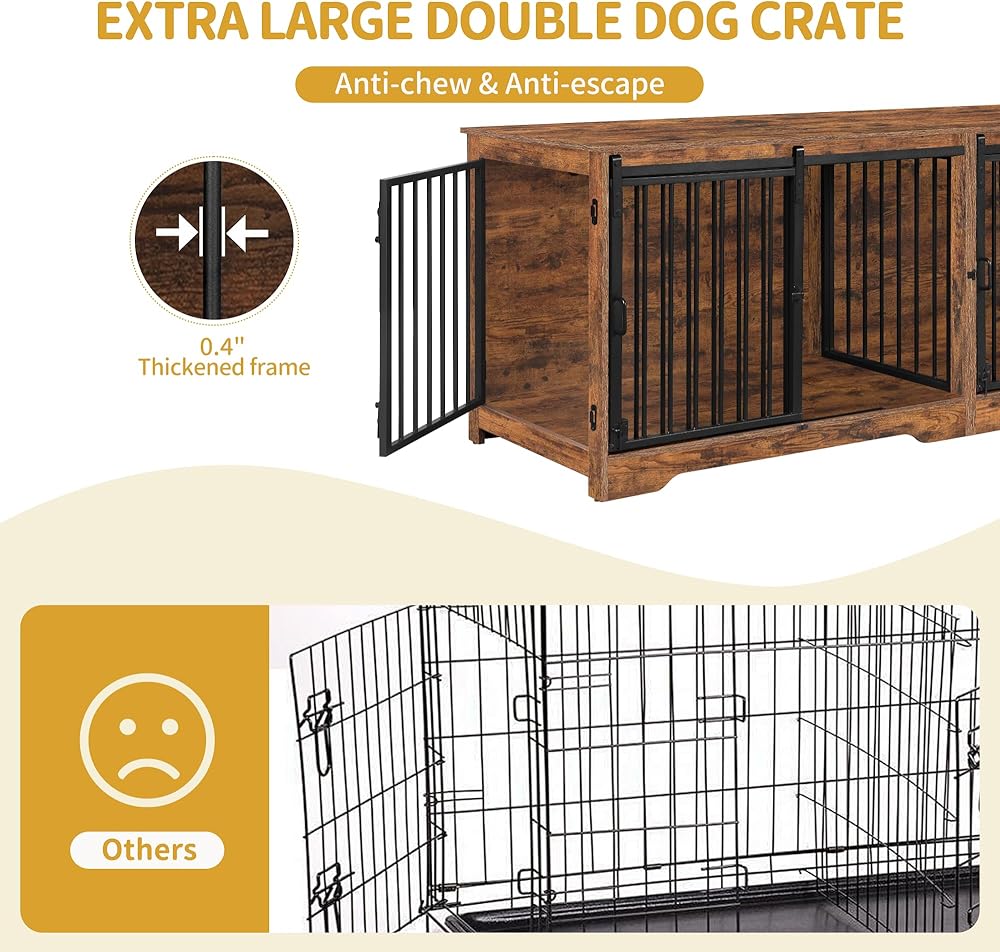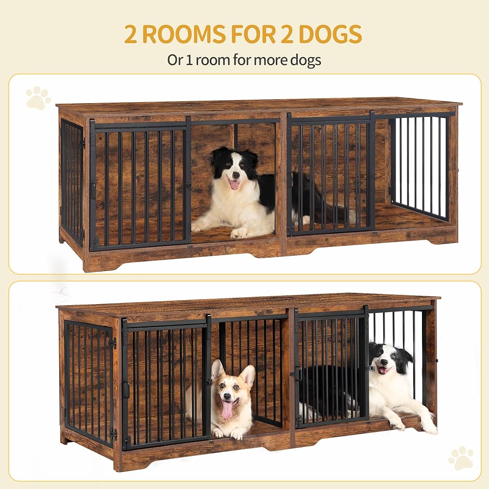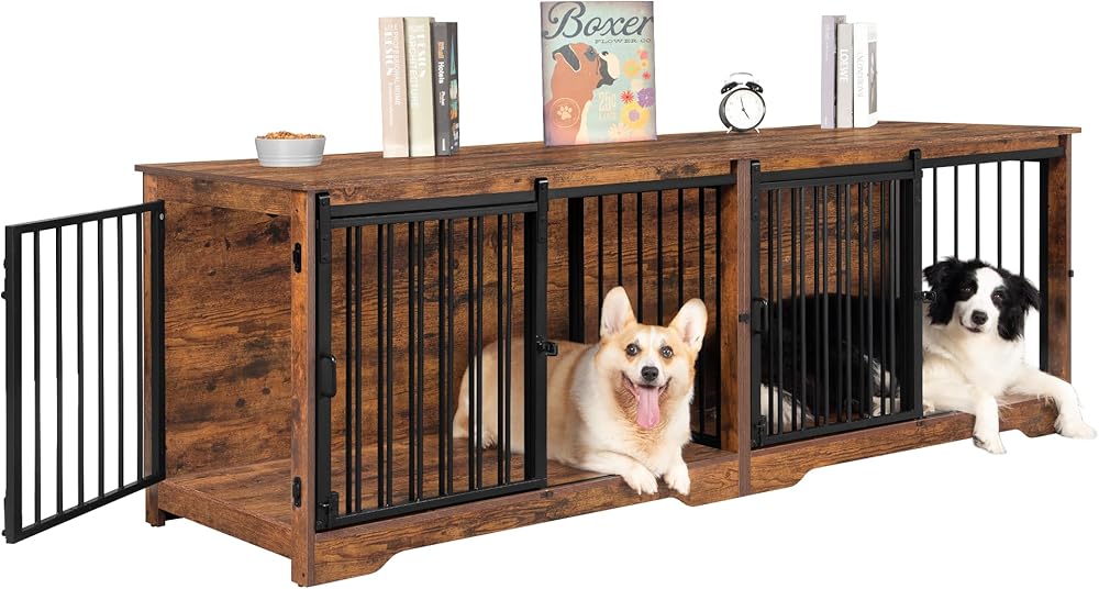 78 بوصة أثاث قفص الكلب ل 2 كلاب ، سلالة كبيرة كبيرة الأثاث قفص الكلب المزدوج ، xxl حامل تلفزيون خشبي سميك ، أثاث بيت الكلب مع مقسم ، طاولة جانبية نهاية ، مكافحة ، بني ريفي ،