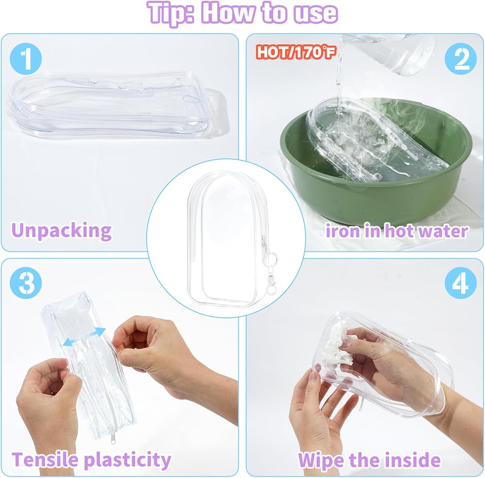 Can be used as a multifunctional storage and display bag, transparent and waterproof appearance, pvc material, can be placed on the desktop vertical, with removable hooks can be hung. Size 7.4*4.2inch, when in use you can use it to store cosmetics, instead of make-up bag, toiletry bag, or children's toys storage bag, plush dolls storage, transparent material can be your dolls or very good display!