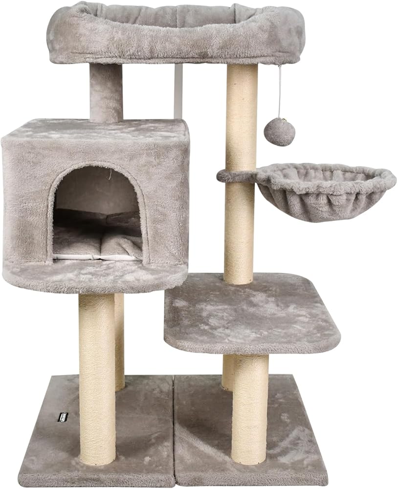 [all in-one feline fun Zone]: ميزات التصميم ذات الطبقتين ، عثمان فخمان ، شقة واحدة واسعة ، 5 SISAL Scratfer Post ، كرة واحدة متدلية وكرة ربيع واحدة ، لوحة خدش واحدة. منشورات خدش الحبل الطبيعي للسماح للقطط الخاصة بك بحماية الأظافر دون ترك علامات مخلب على الأثاث.