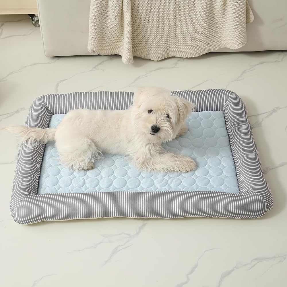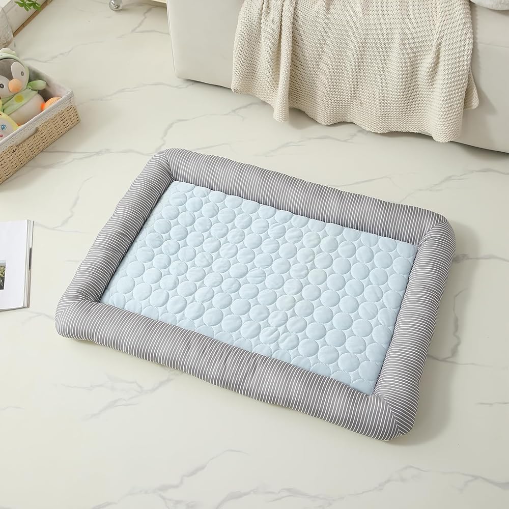 Transform your pet's resting experience with this premium cooling mat featuring a sophisticated quilted surface design in soothing light blue. The plush mat is expertly crafted with a distinctive gray striped border that adds a touch of style to any room decor. Perfect for both cats and dogs, this cooling mat helps your furry friend stay comfortable during warm days. The quilted surface provides an extra layer of cushioning while maintaining its cooling properties. The generous padding and carefully constructed border ensure your pet has a cozy spot to relax. The elegant combination of light blue and gray stripes makes this mat a tasteful addition to your home while giving your pet their own special place to rest. Easy to clean and maintain, this mat is ideal for indoor use and offers a perfect balance of comfort and functionality for your beloved pet.