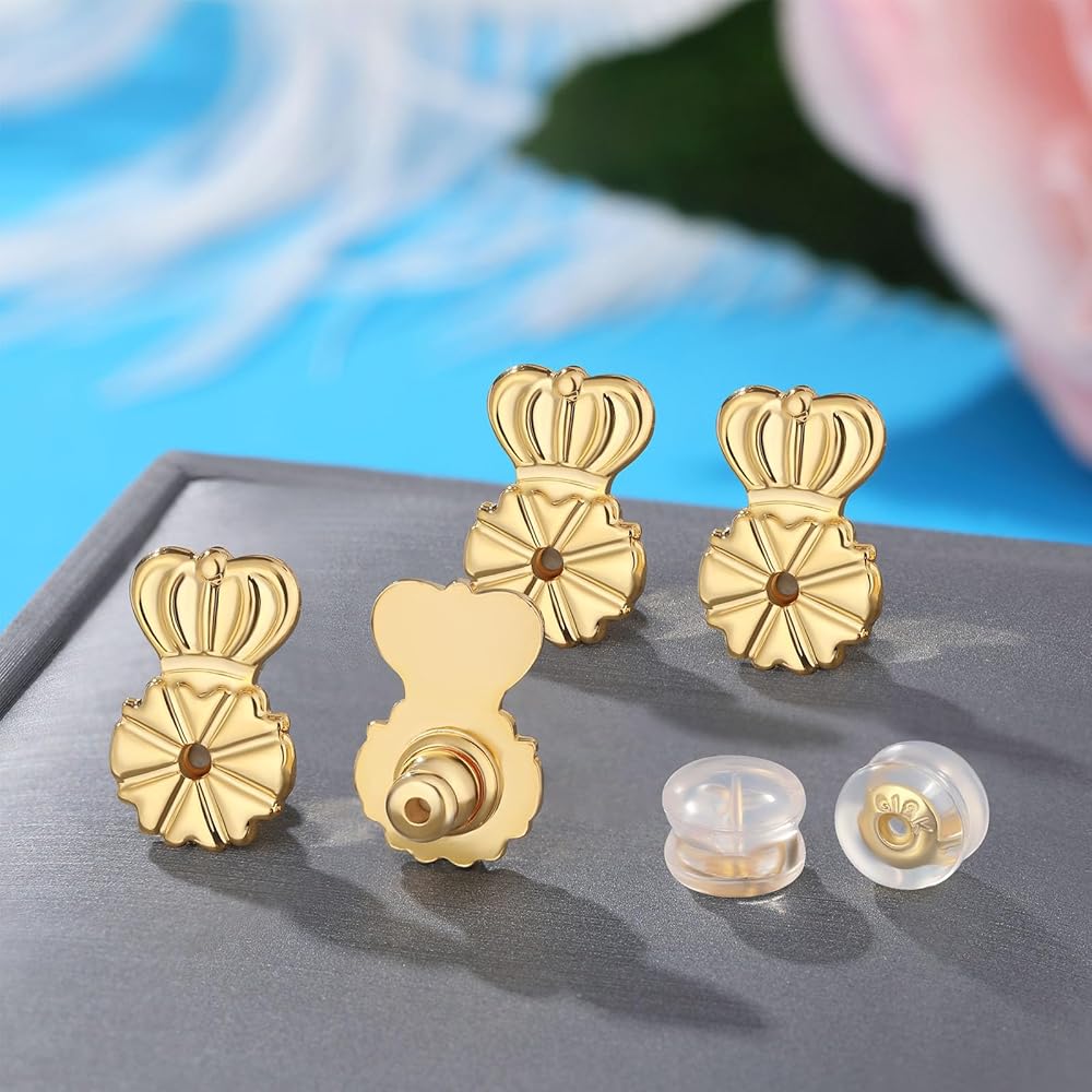 【ما ستحصل عليه】 ستحصل على 4 مساءً رافعة شكل التاج الذهبية 4 مساءً ودخل سيليكون 2 PC ، وحجم حلق شكل التاج تقريبًا. 10 مم و 6 مم من ظهور السيليكون ، وهو ما يكفي لتلبية احتياجاتك على المدى الطويل ، يمكن أن تجلب لك أيضًا تجربة ارتداء مريحة