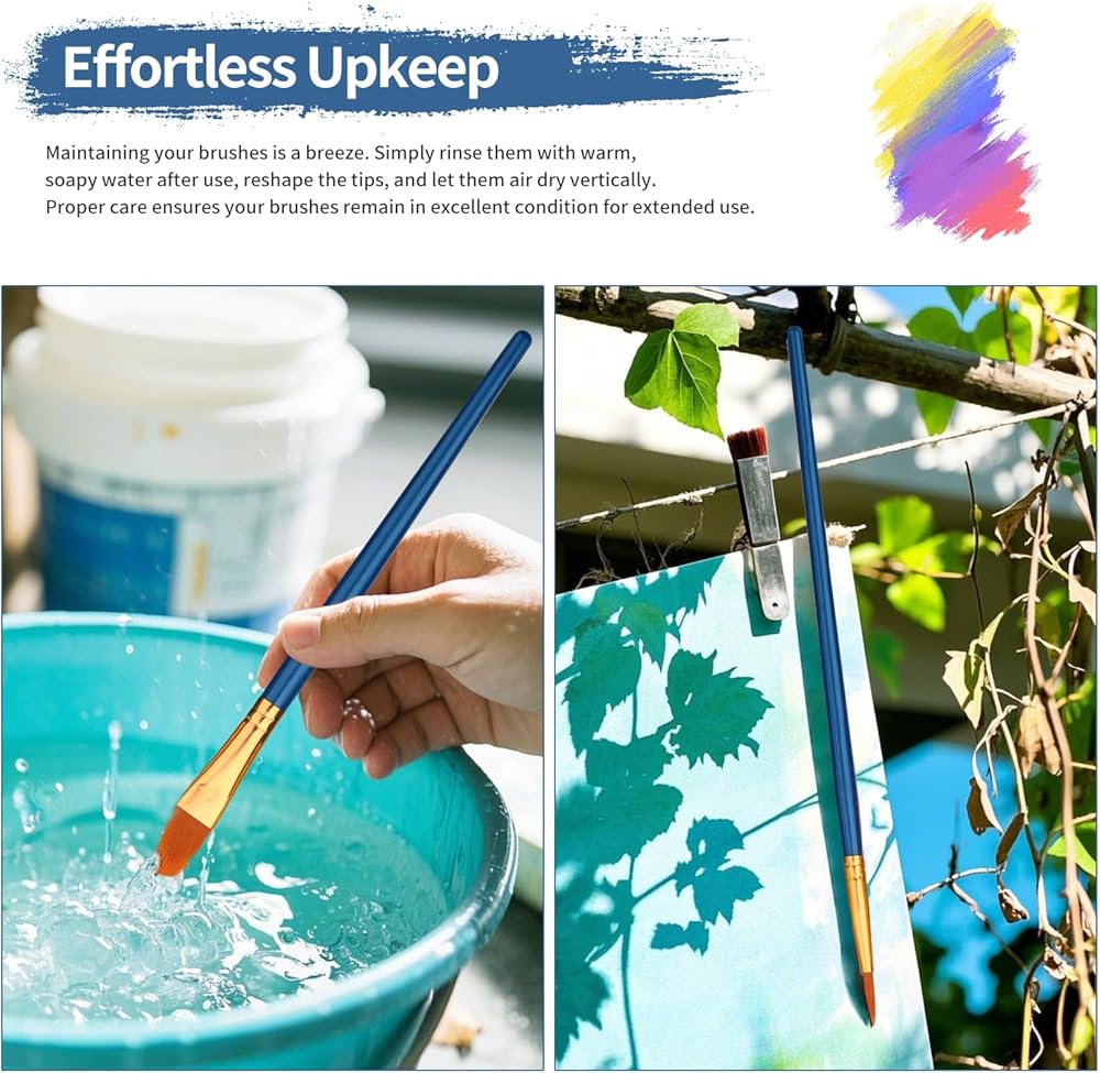 【Effortless Upkeep】: Maintaining your brushes is a breeze. Simply rinse them with warm, soapy water after use, reshape the tips, and let them air dry vertically. Proper care ensures your brushes remain in excellent condition for extended use.