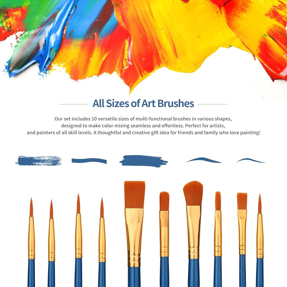 【All Sizes of Art Brushes】Our set includes 10 versatile sizes of multi-functional brushes in various shapes, designed to make color mixing seamless and effortless. Perfect for artists, and painters of all skill levels. A thoughtful and creative gift idea for friends and family who love painting!