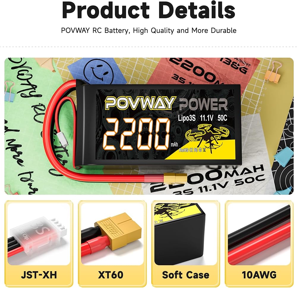 【What You Get】- 2 Pack of POVWAY 11.1V 50C 2200mAh Lipo Battery with XT60 Plug.