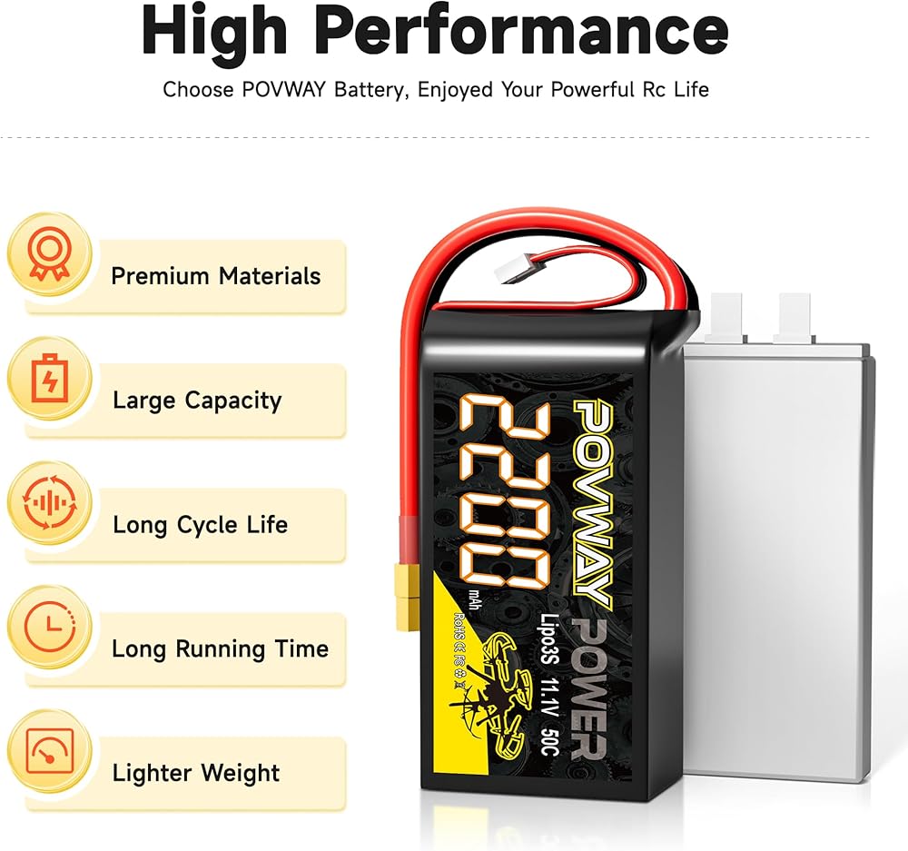 【High-Performance 11.1V RC Battery】- A lighter, more compact design paired with a 50C discharge rate and 2200mAh capacity delivers ample power, explosive thrust, and extended cycle life — empowering you to dominate every RC adventure with unmatched performance and reliability.