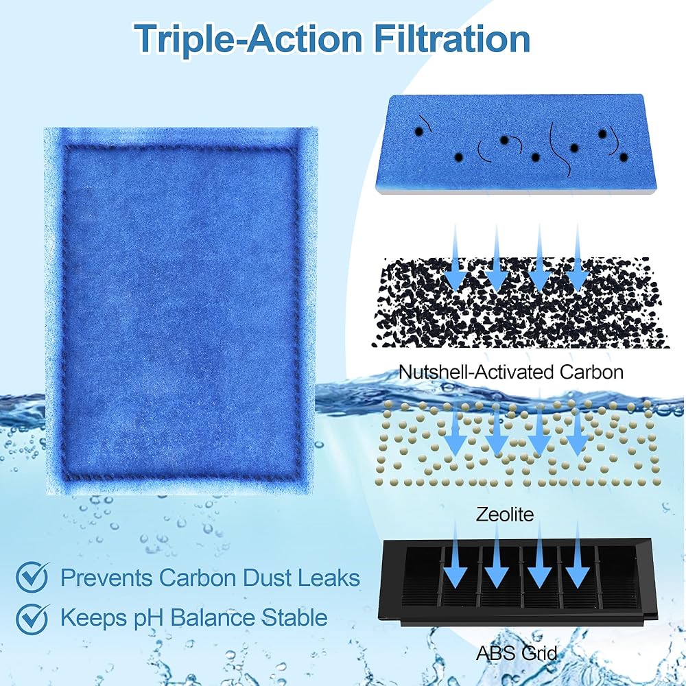 Premium Water Filtration - Triple-action filtration for a pristine aquarium.The high-quality mesh layer traps debris, fish waste, and other particles, ensuring crystal-clear water and a healthy, thriving aquarium for your fish to flourish in. ABS grid design prevents carbon dust leakage, ensuring your activated carbon stays fully effective and that your tank water remains free of contaminants.