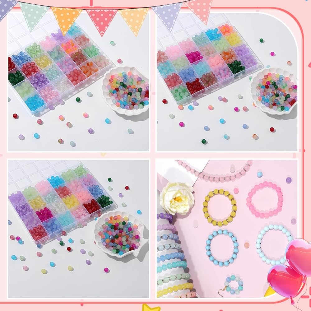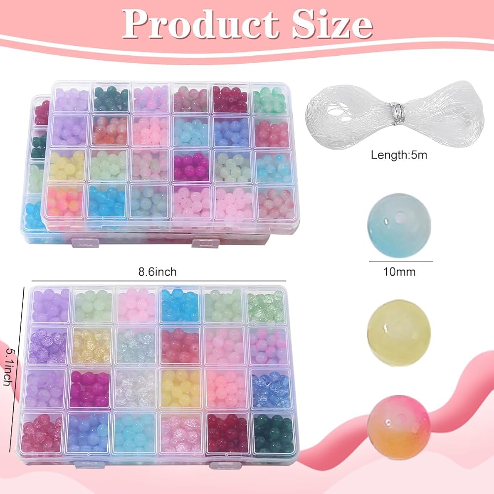 • CHARMING 3 IN 1 GLASS BEADS -You will receive 1800pcs 8mm glass beads with 13 types of monochrome glass beads, 8 types of crackle crystal beads, 11 types of bicolor glass beads, 38 colors, 25pcs of each color, and three bundles of white 30m elastic crystal wires, with 24 compartments of storage box so that you can find the color you need at a glance, no more confusing, carrying and storing them anywhere.