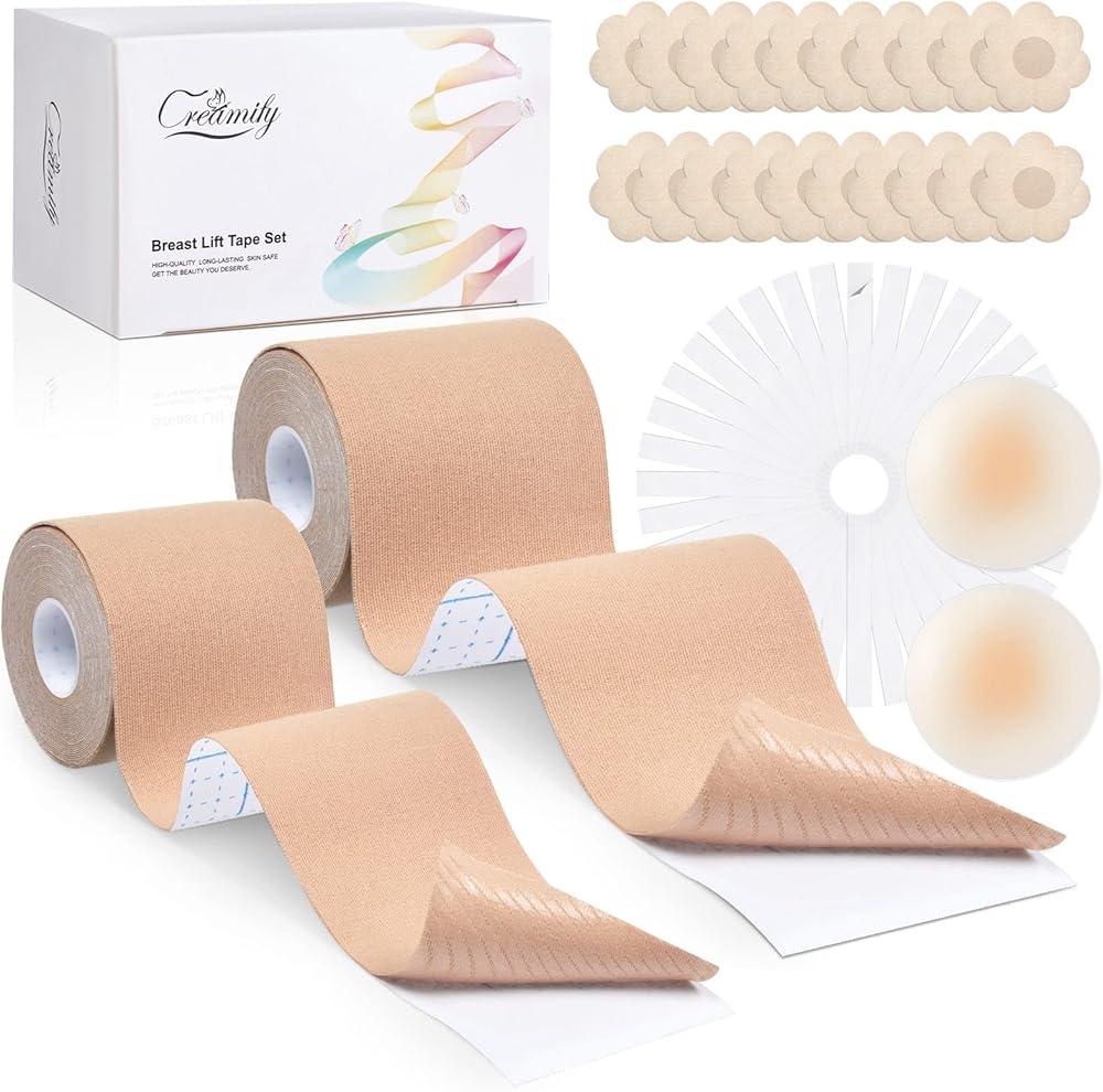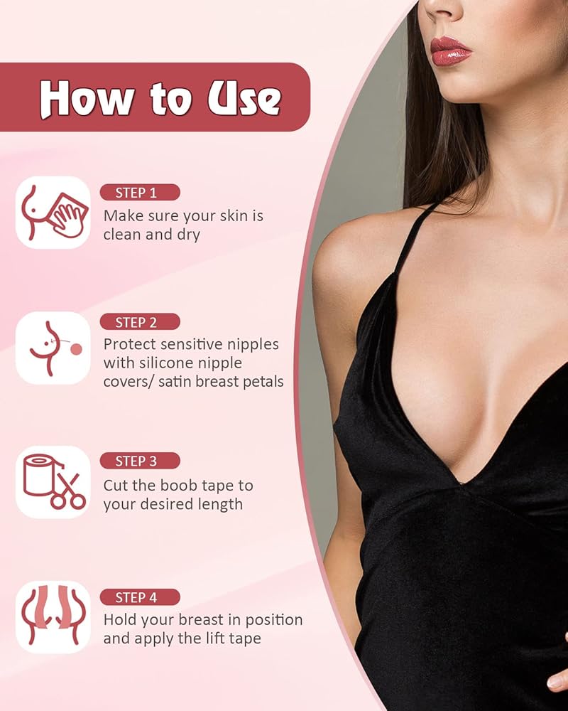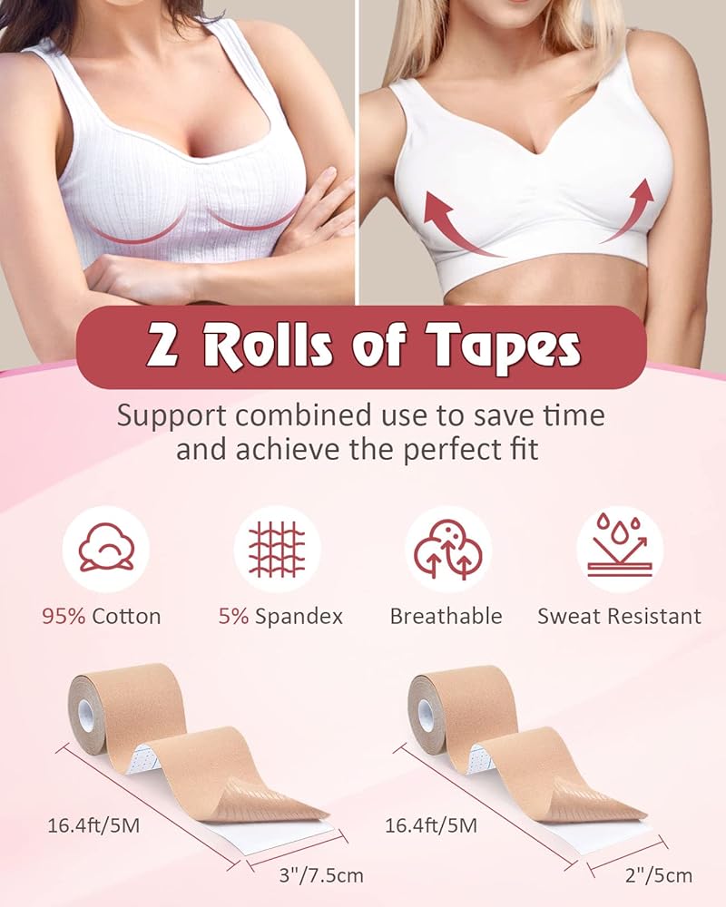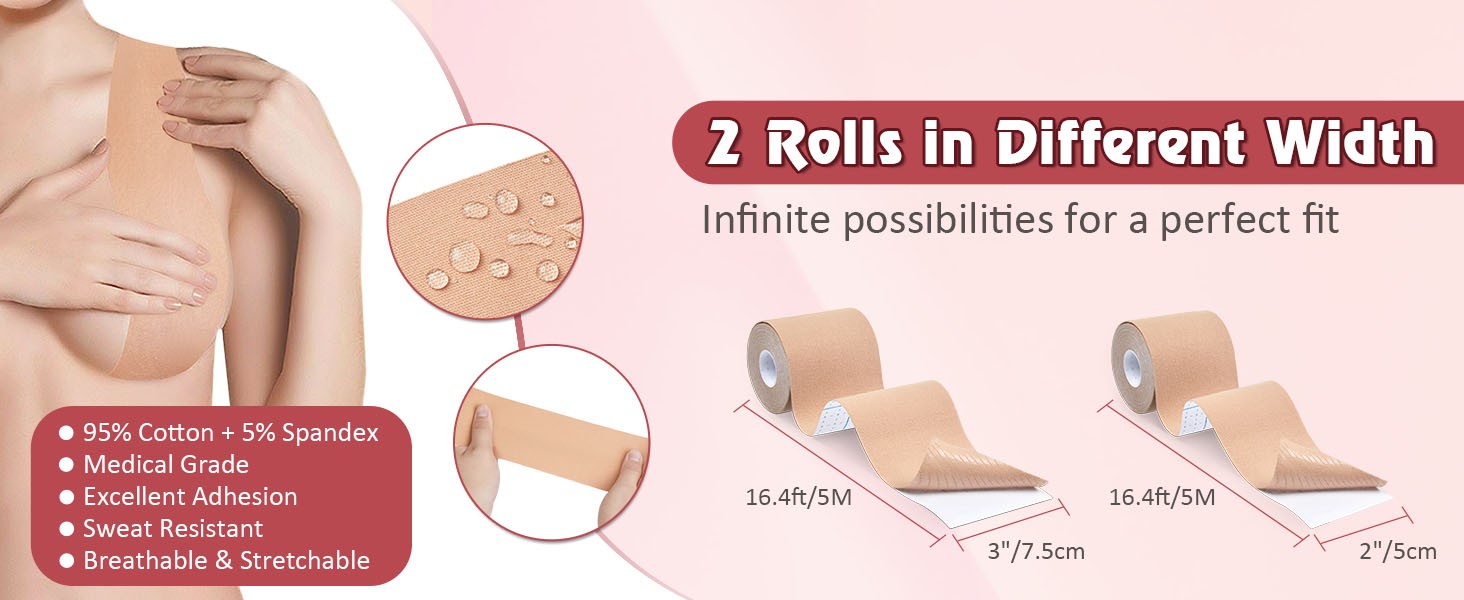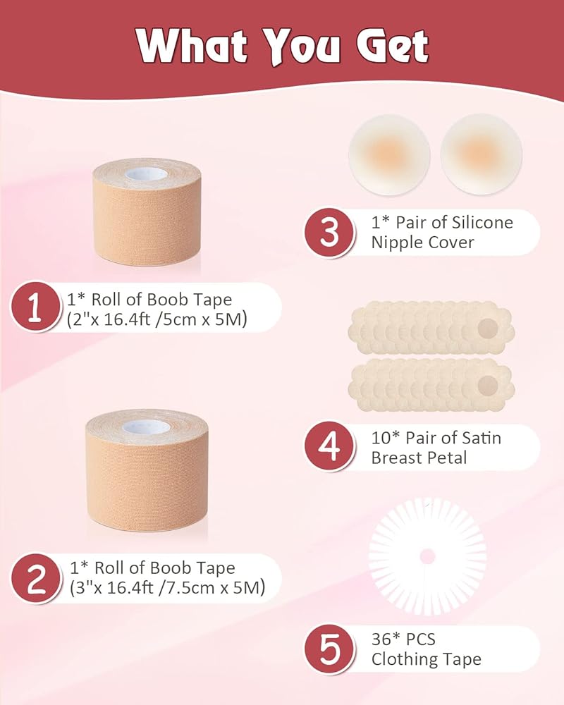 مجموعة الكل في واحد: سوف تحصل على 1* لفة من شريط الصدر (2 بوصة × 16.4 قدم /5 سم × 5 م)؛ 1 * لفة من شريط الصدر (3 بوصة × 16.4 قدم /7.5 سم × 5 متر)، أكثر ملاءمة ثدي كبير، 1* زوج من غطاء حلمة السيليكون، 10* زوج من بتلات الثدي الساتان، 36* قطعة شريط على الوجهين، 1* دليل مستخدم مفصل.