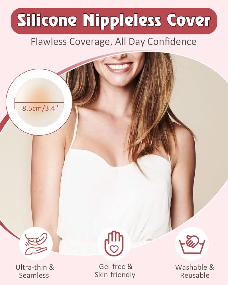 أغطية حلمات السيليكون وبتلات الثدي الساتان: أغطية الحلمات المصنوعة من السيليكون مقاس 8.5 سم/3.4 بوصة قابلة للغسل وإعادة الاستخدام وتوفر تغطية سلسة وغير ملحومة وتحمي حلماتك. كما أن بتلات الثدي الساتان غير مرئية تحت الملابس وتمنع بشكل فعال تهيج الحلمات.