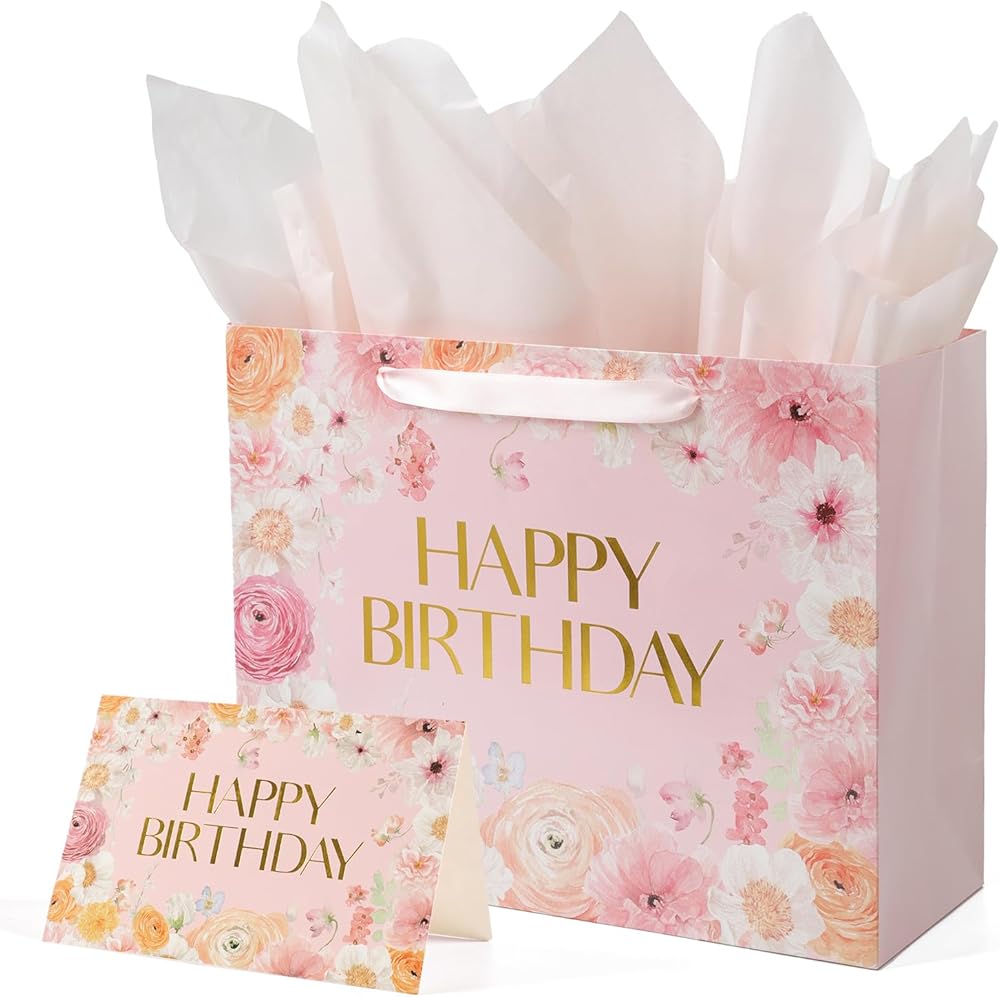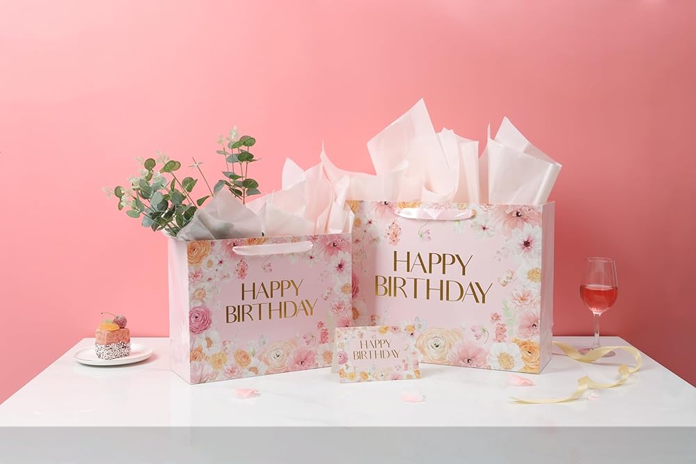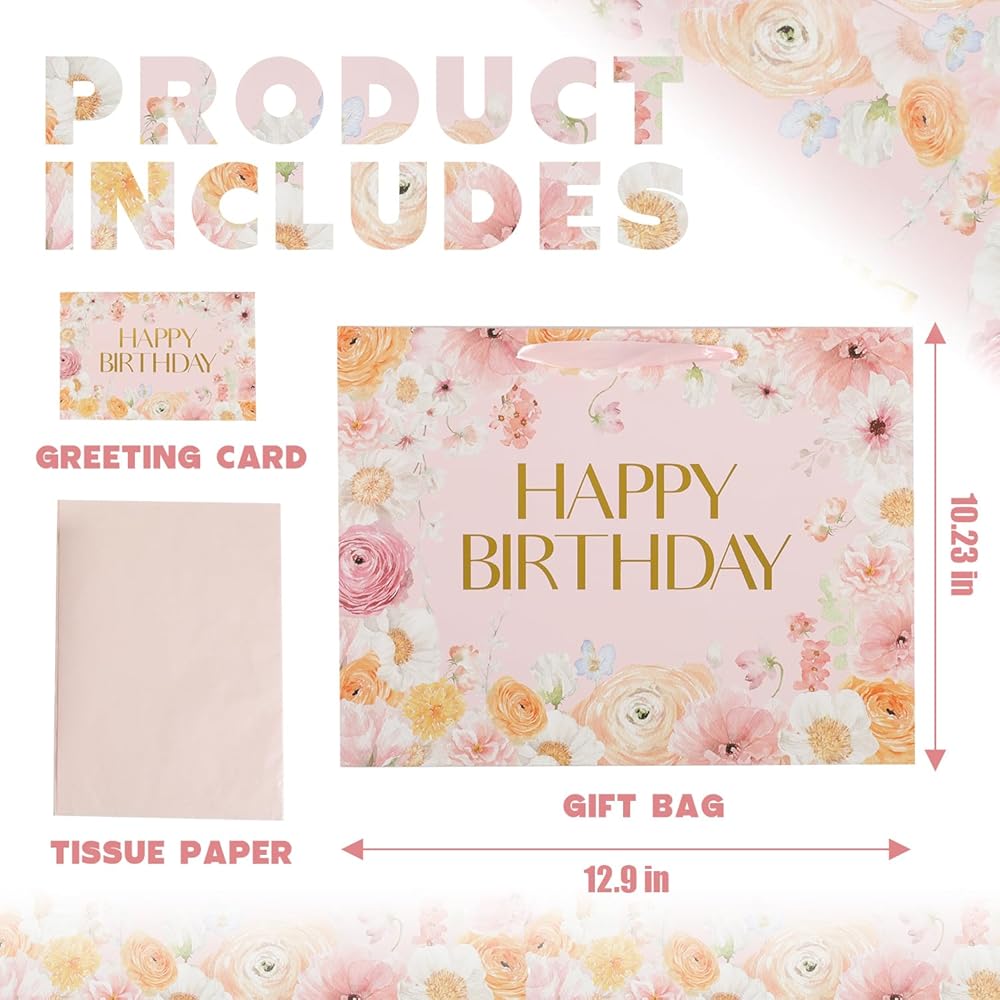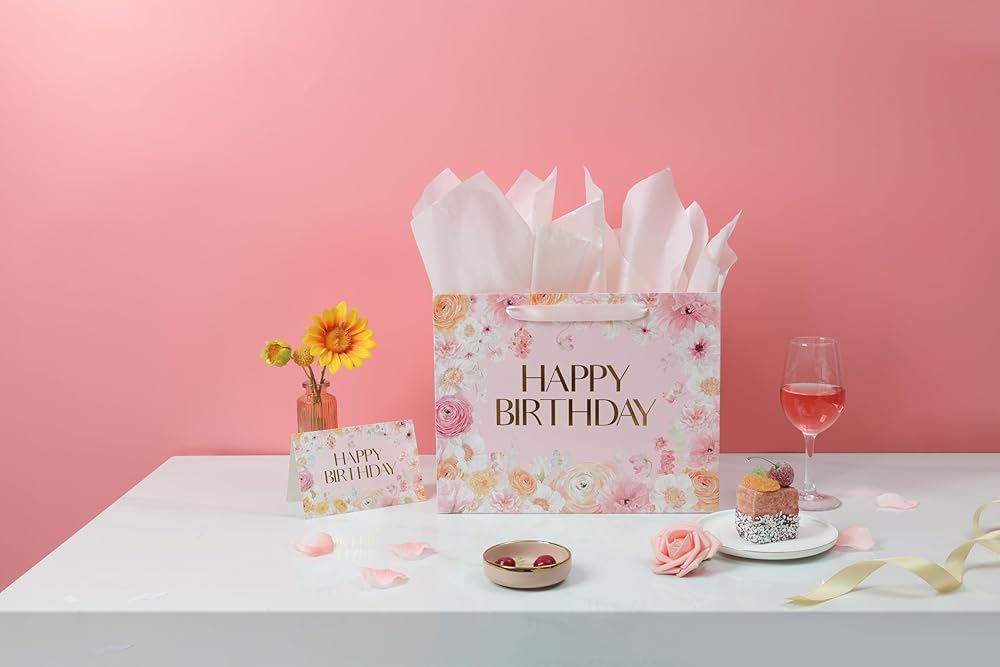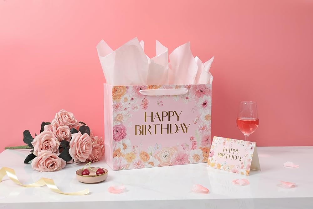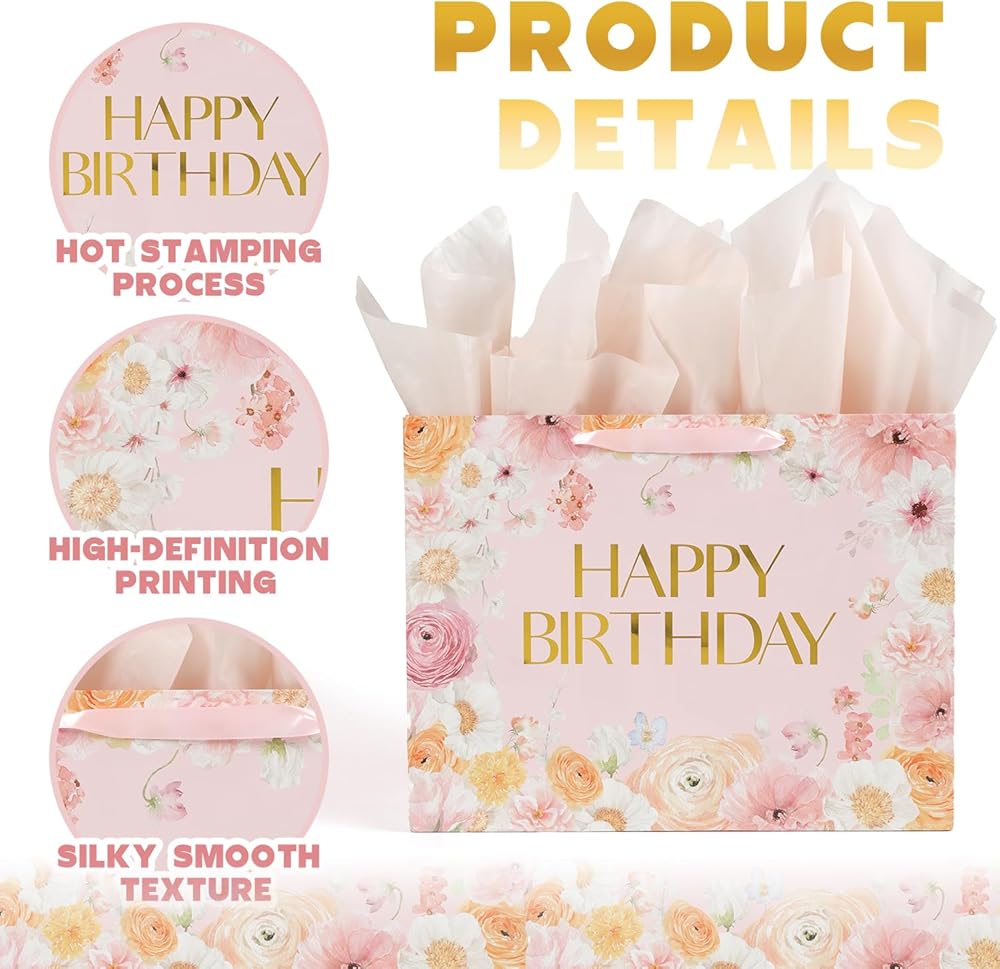 • [تصميم مميز] تتميز حقيبة الهدايا بتصميم رائع. خلفيتها الوردية الساحرة تثير صورة حقل من الزهور البرية. إضافة إلى أناقتها ، فإن عبارة "عيد ميلاد سعيد" ساخنة بشكل جميل - مختوم بالذهب ، وتشرب الحقيبة مع رغبات القلبية وبركاته الطيبة.