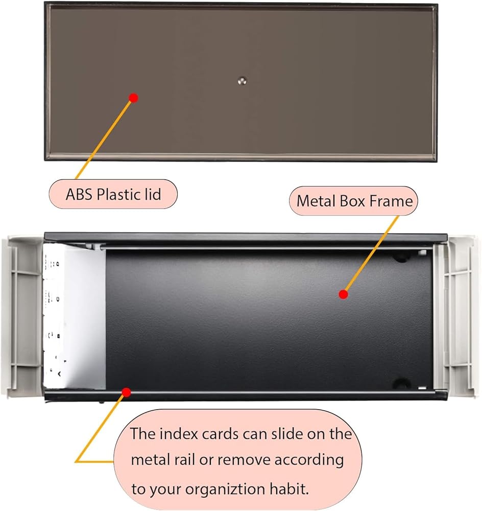 DURABLE CONSTRUCTION: Metal case with with gray plastic lid for durability, includes removable dividers and A-Z letter index tabs for easy organization.