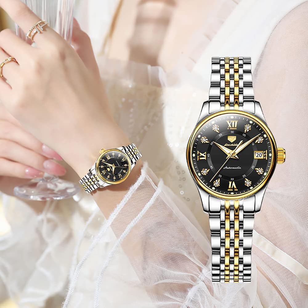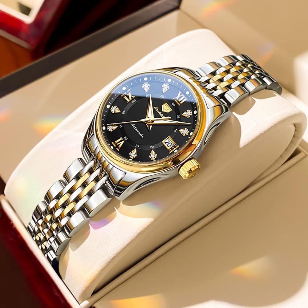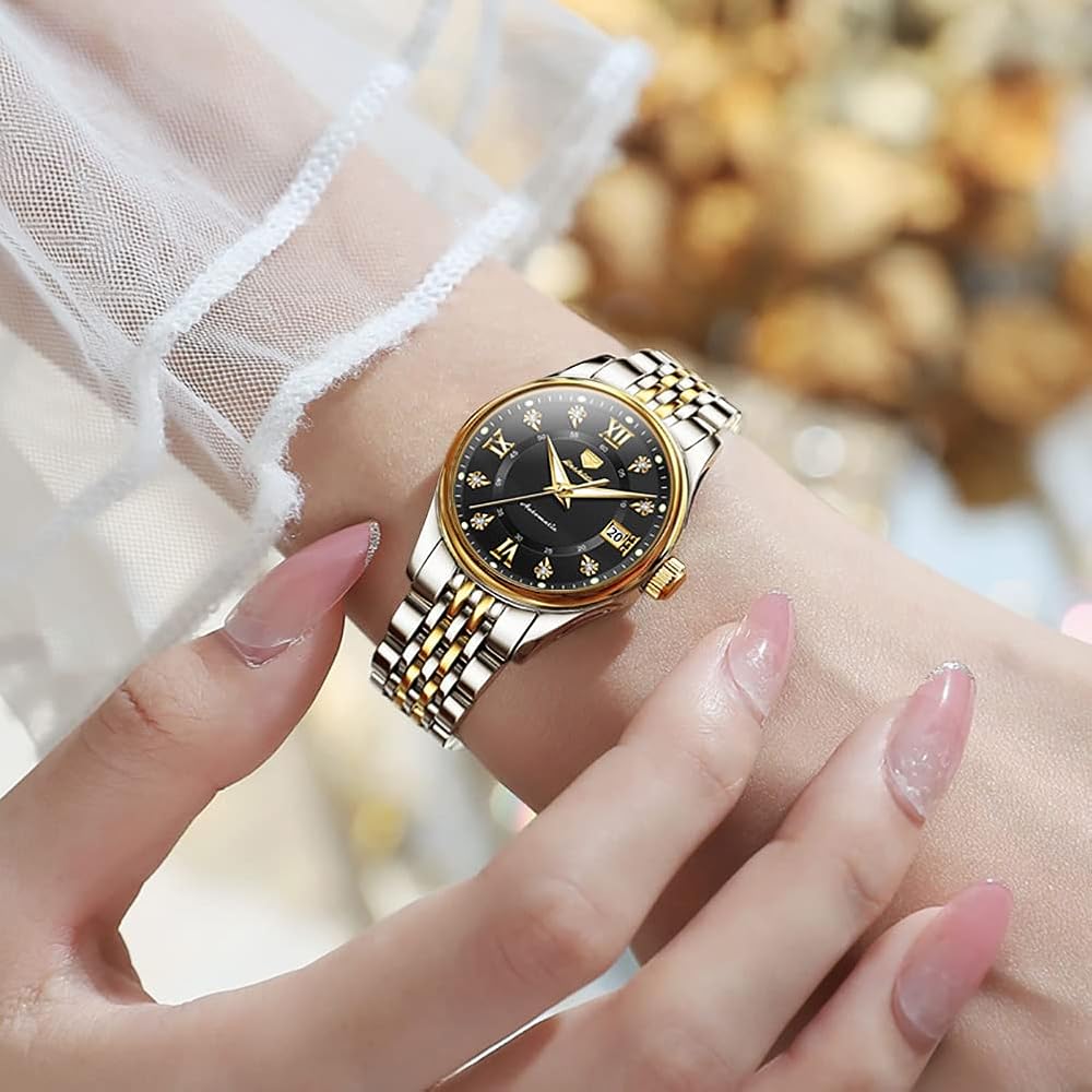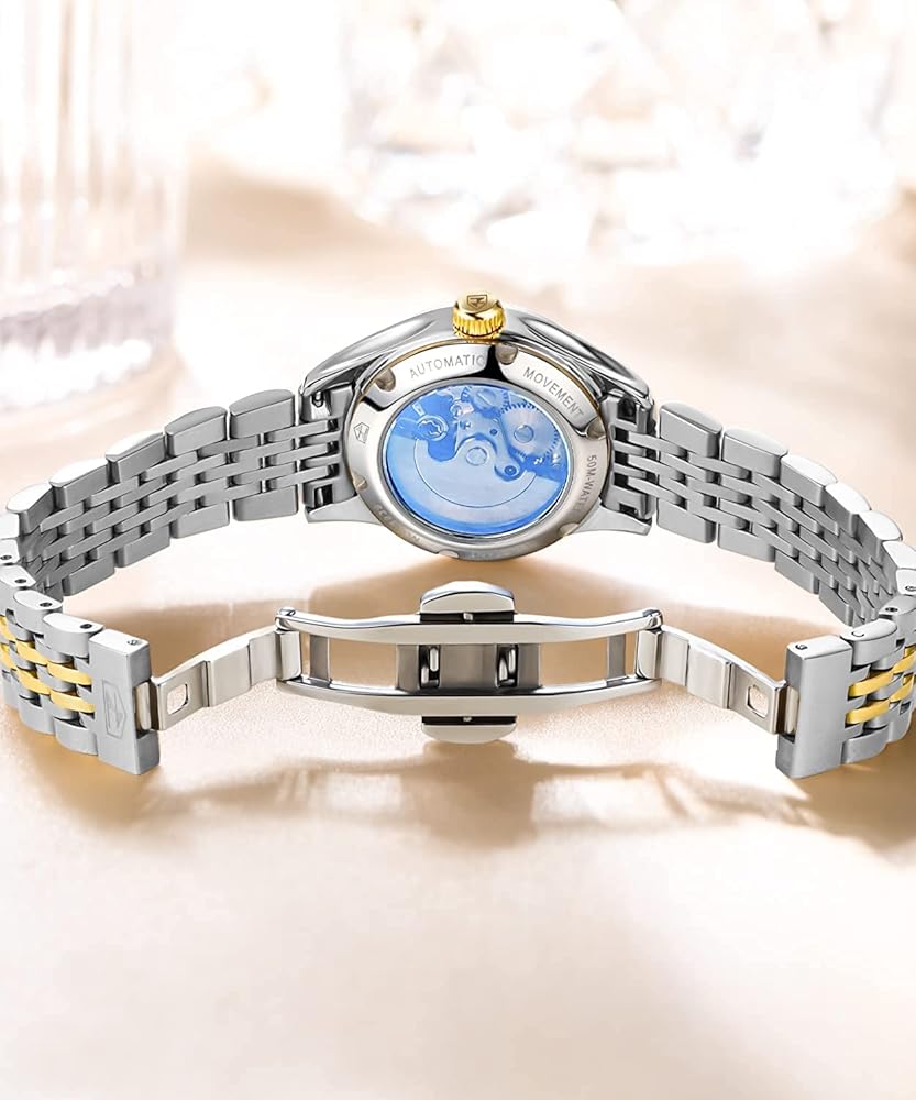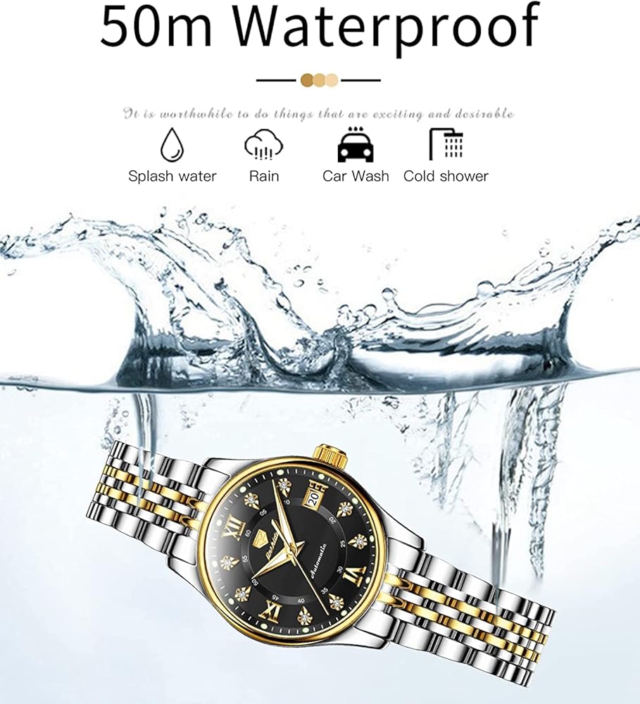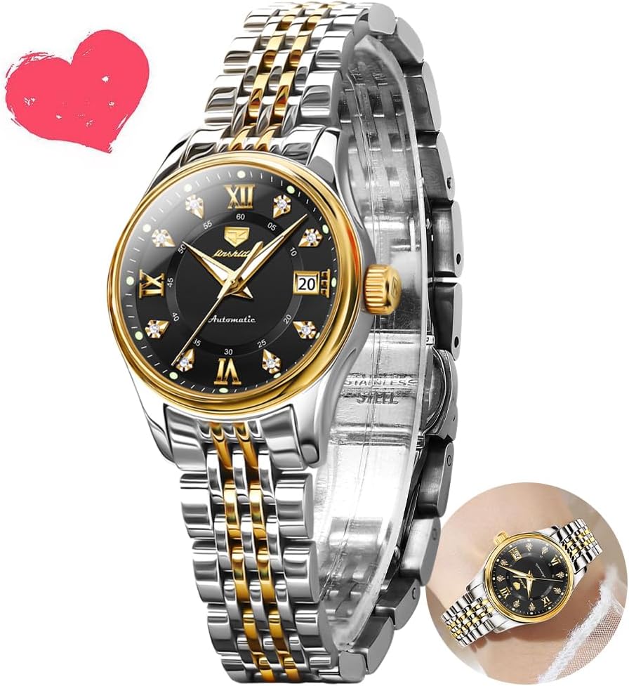 ⌚ حزام من الفولاذ المقاوم للصدأ قابل للتعديل: يتميز السوار المصنوع من الفولاذ المقاوم للصدأ بريق جميل وطبقات رقيقة ومرونة وتهوية ومتانة وراحة. زر كبس مزدوج على شكل فراشة من الفولاذ المقاوم للصدأ، دقيق وسهل التشغيل. (ساعة نسائية أوتوماتيكية، طول الحزام 18 سم، إذا لم يكن طويلاً بما يكفي، يمكنك الاتصال بالبائع، وسوف تحصل على حزام الساعة مجانًا)