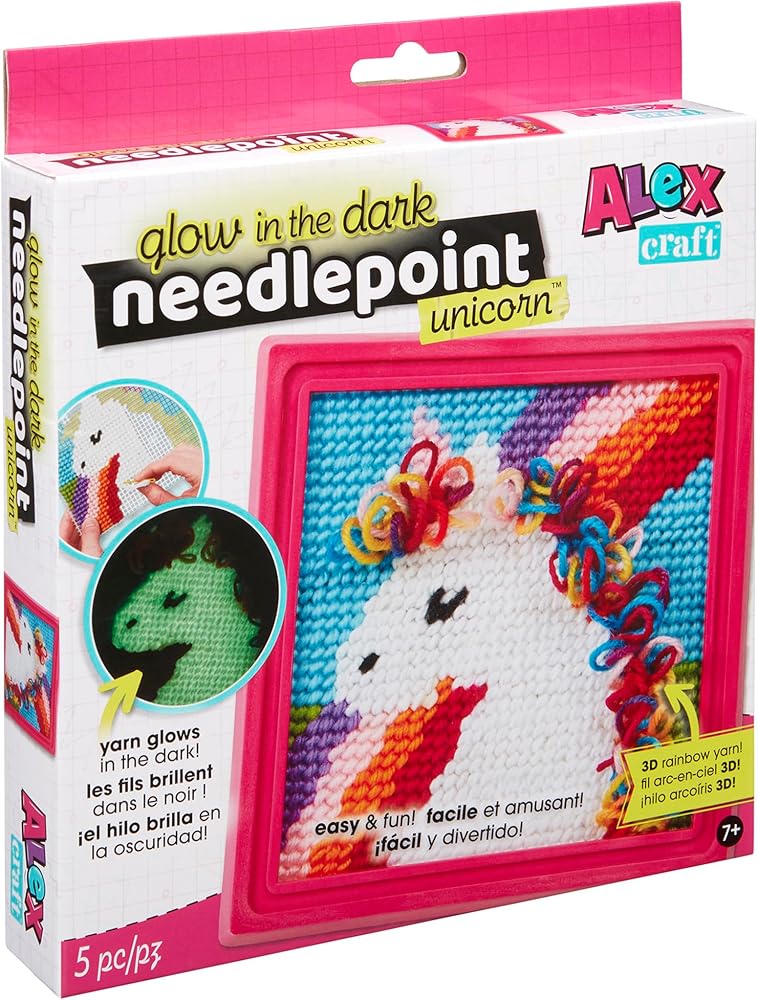 Alex: Glow-in-the-dark needlepoint-Unicorn & Rainbow-DIY Kit ، Learn to Needlepoint ، all-in-1 stervers verbroidery kit ، تشمل الإطار ، الأطفال البالغ من العمر 7 سنوات