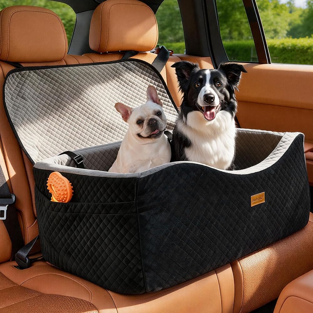 مقعد سيارة للكلاب الكبيرة يصل وزنها إلى 60 رطلاً أو كلبين صغيرين مع إسفنج ذو ذاكرة 4 بوصات، مقعد خلفي متوسط الحجم للحيوانات الأليفة مع أحزمة أمان ثلاثية، مقاود قابلة للتعديل، قابلة للفصل/الغسل (أسود/رمادي، كبير)