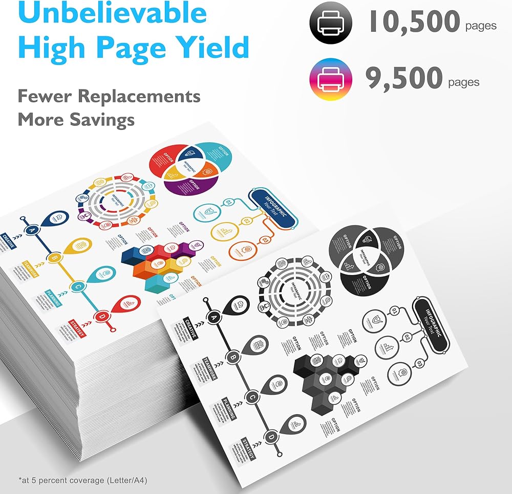 ✅【 عائد الصفحة المرتفعة】: ما يصل إلى 15000 صفحة لكل الحبر الأسود ، 9500 صفحة لكل حبر لون بناءً على تغطية 5 ٪ (رسالة /A4) ، مثالية للمستخدمين ذوي الاحتياجات ذات الحجم الكبير للطباعة وتقليل الاستبدال المتكرر
