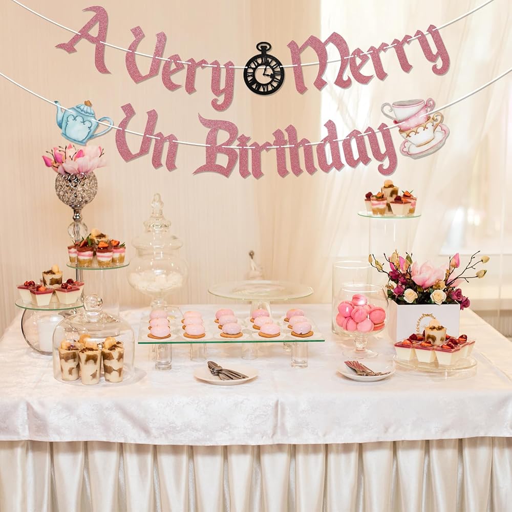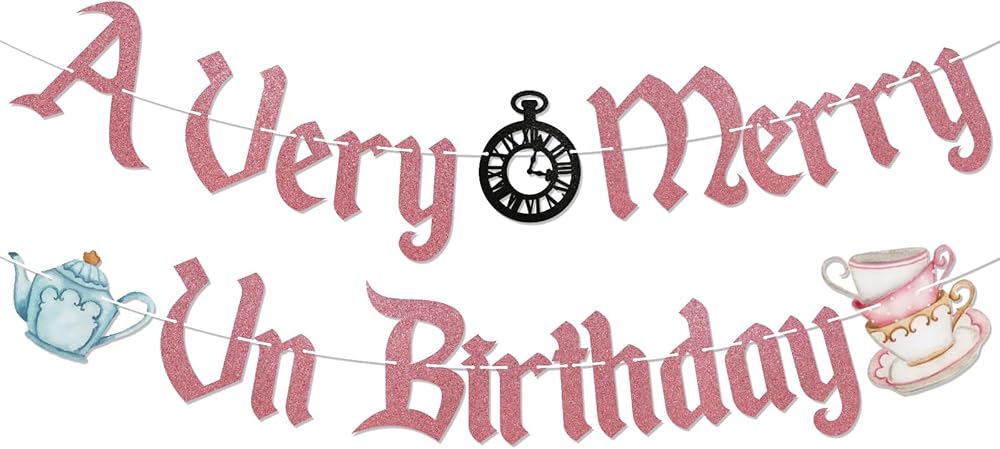 A BIG HIT - this glittery A Very Merry UnBirthday banner is designed for Wonderland Themed Tea Party/Birthday Party. It's a way for people to say enjoy your party to girls. This year, Wonderland Birthday Party will be even more cheerful with this A Very Merry UnBirthday banner.