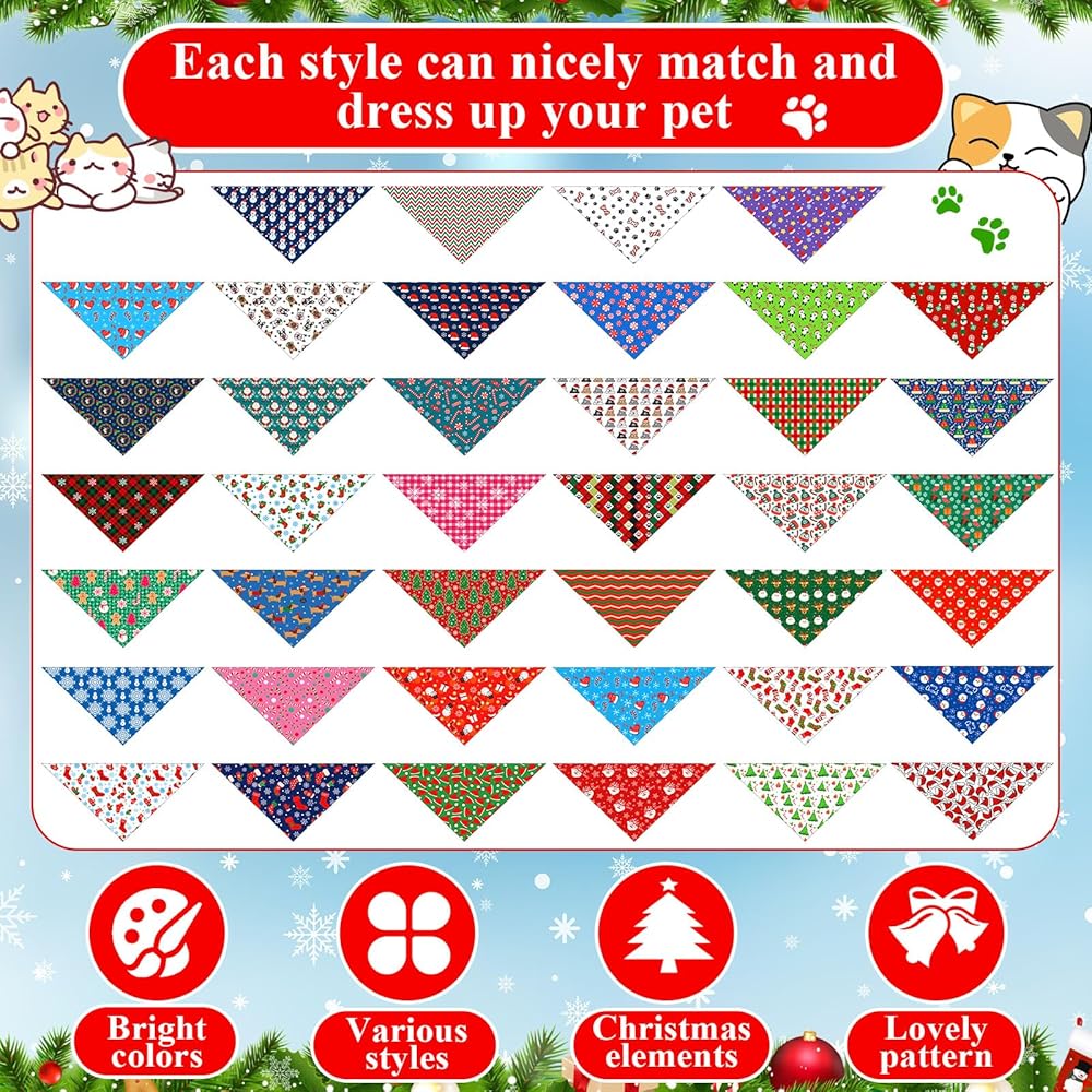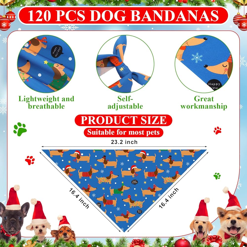 • Dog Bandanas Bulk: this set includes 120 dog bandanas for small to medium dogs, featuring 40 unique patterns with 3 pieces per design; The variety of bright colors and creative prints makes them great for everyday wear, photo props, or festive occasions; Ideal for decorating pets, dog models, and holiday dress-up, these bandanas can also be shared with friends