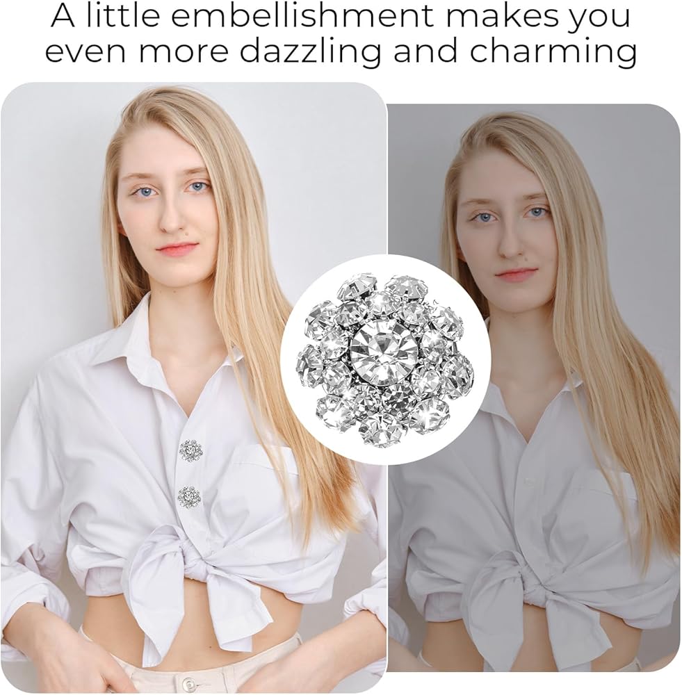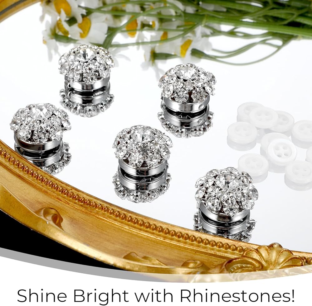Button Set: You will receive 5 sets of rhinestone buttons sets, including 5 rhinestone button sets and 10 sewing buttons. These sparkling rhinestone buttons add beauty and uniqueness to any outfit, making ordinary shirts look sophisticated and unique with their elegant and eye-catching designs.