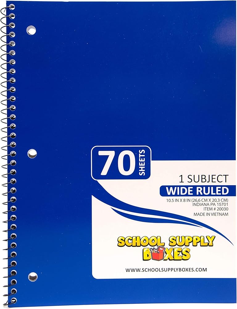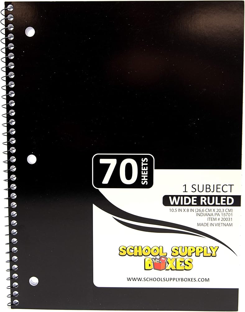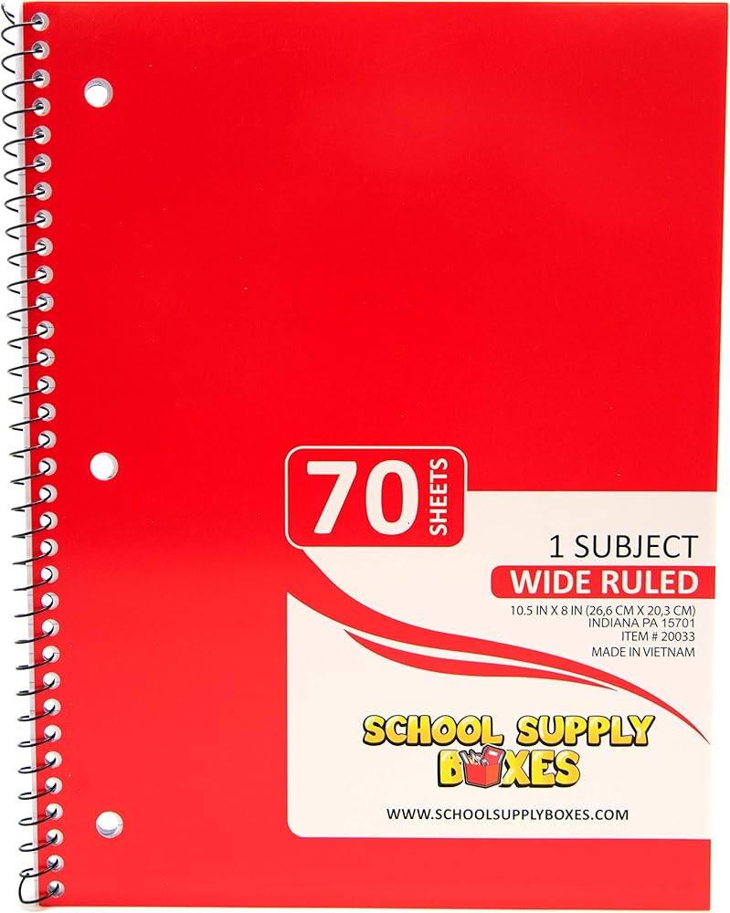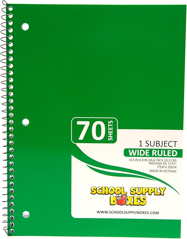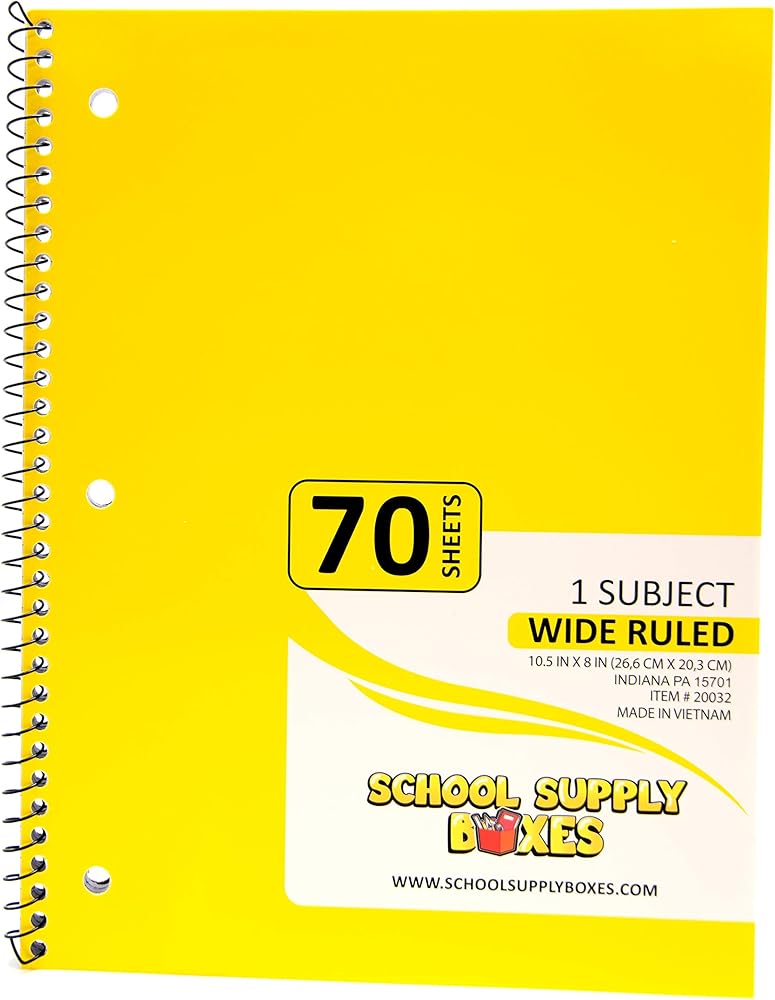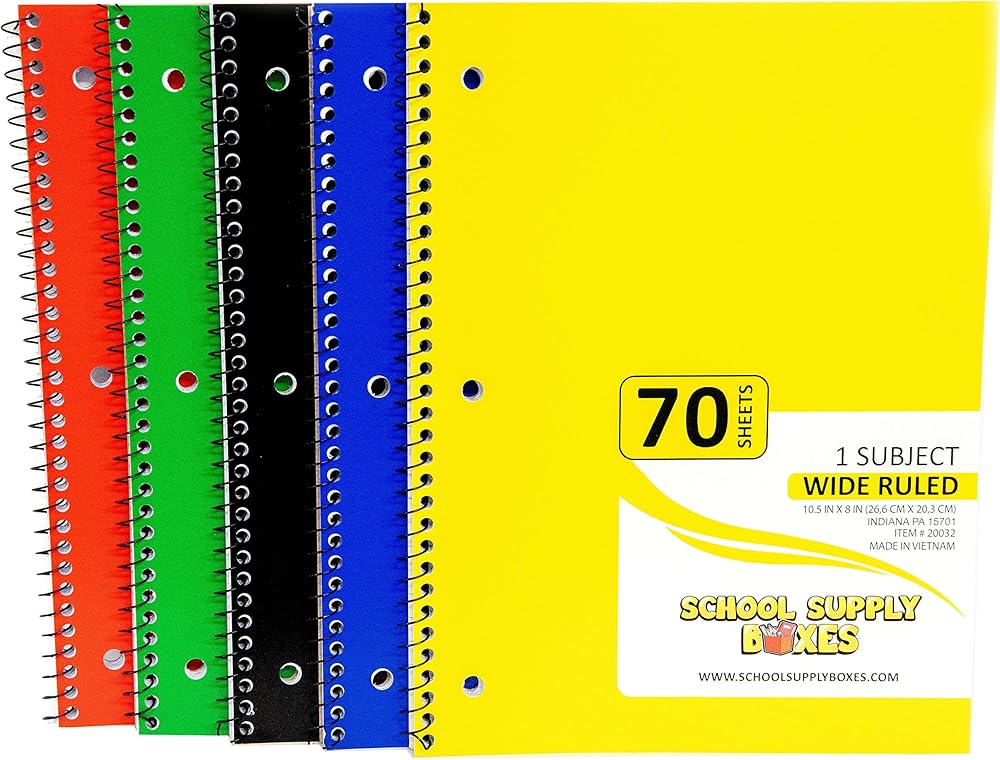 • An essential staple of students and professionals, this wide ruled spiral notebook bundle is perfect for those looking for a great deal on school supplies. This 5pack set of one subject spirals contains 1 red spiral notebook, 1 blue spiral notebook, 1 black spiral notebook, 1 yellow spiral notebook, and 1 green spiral notebook.