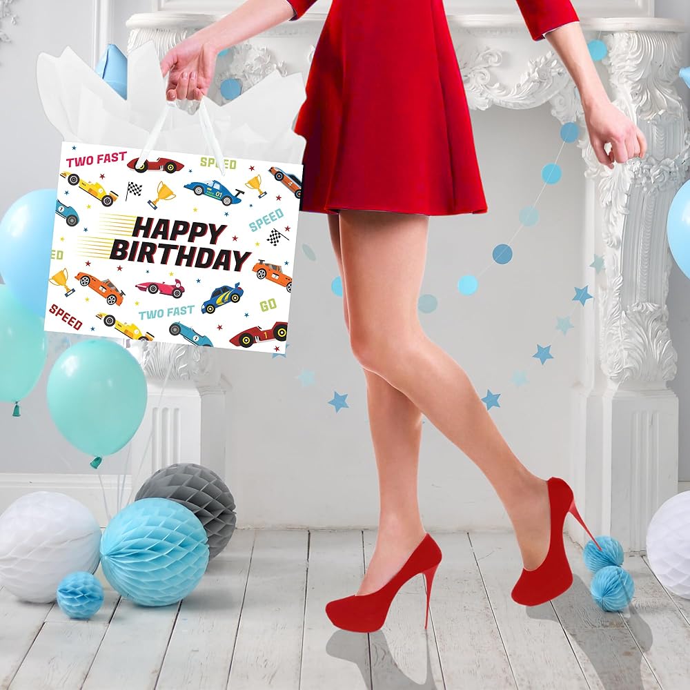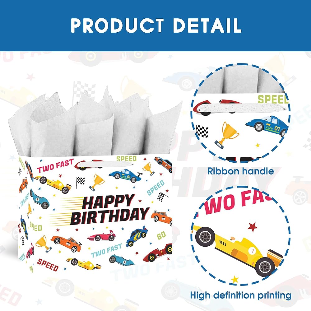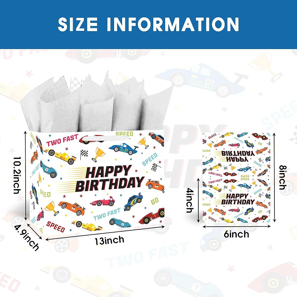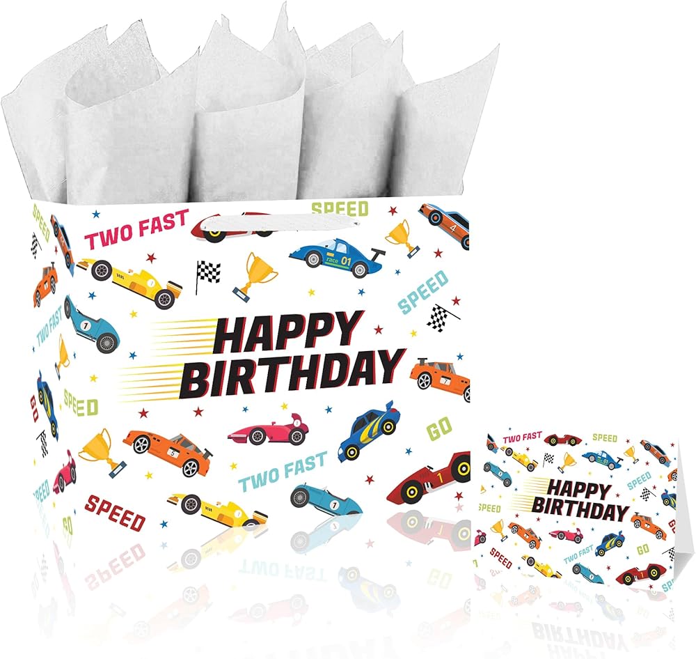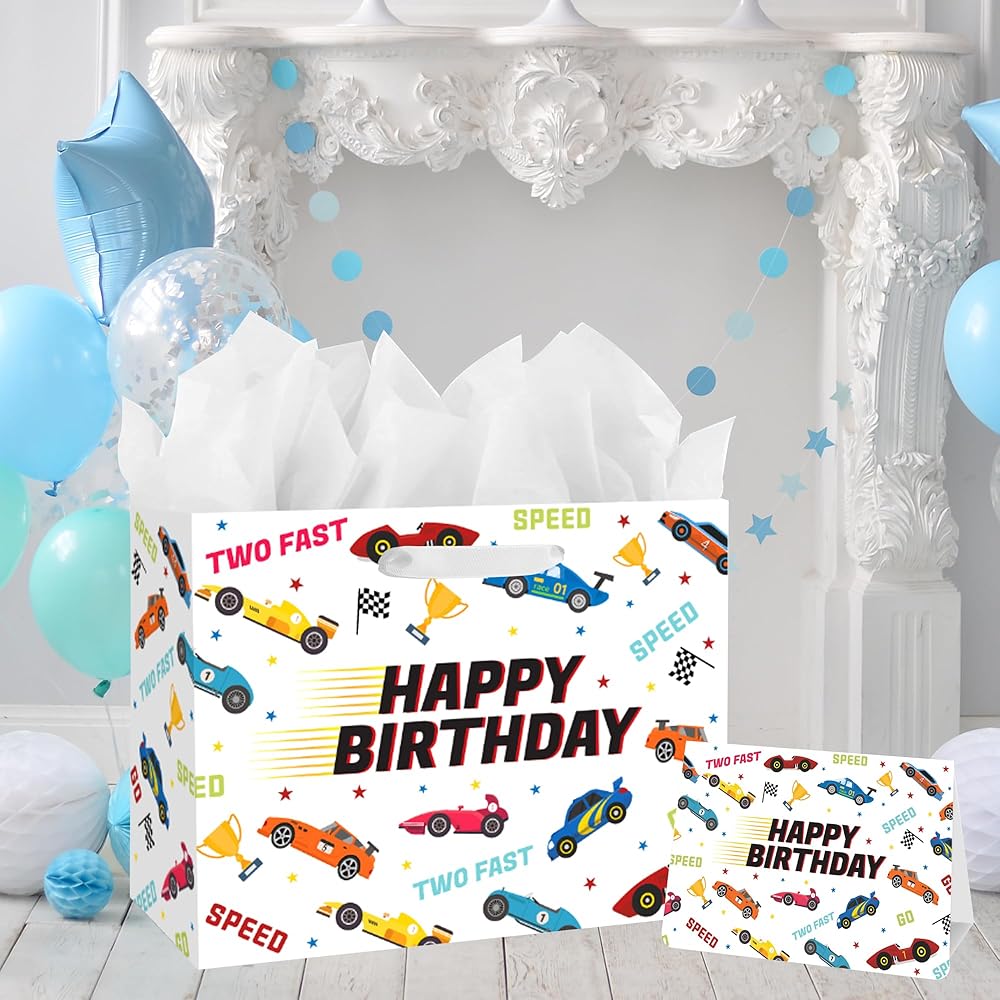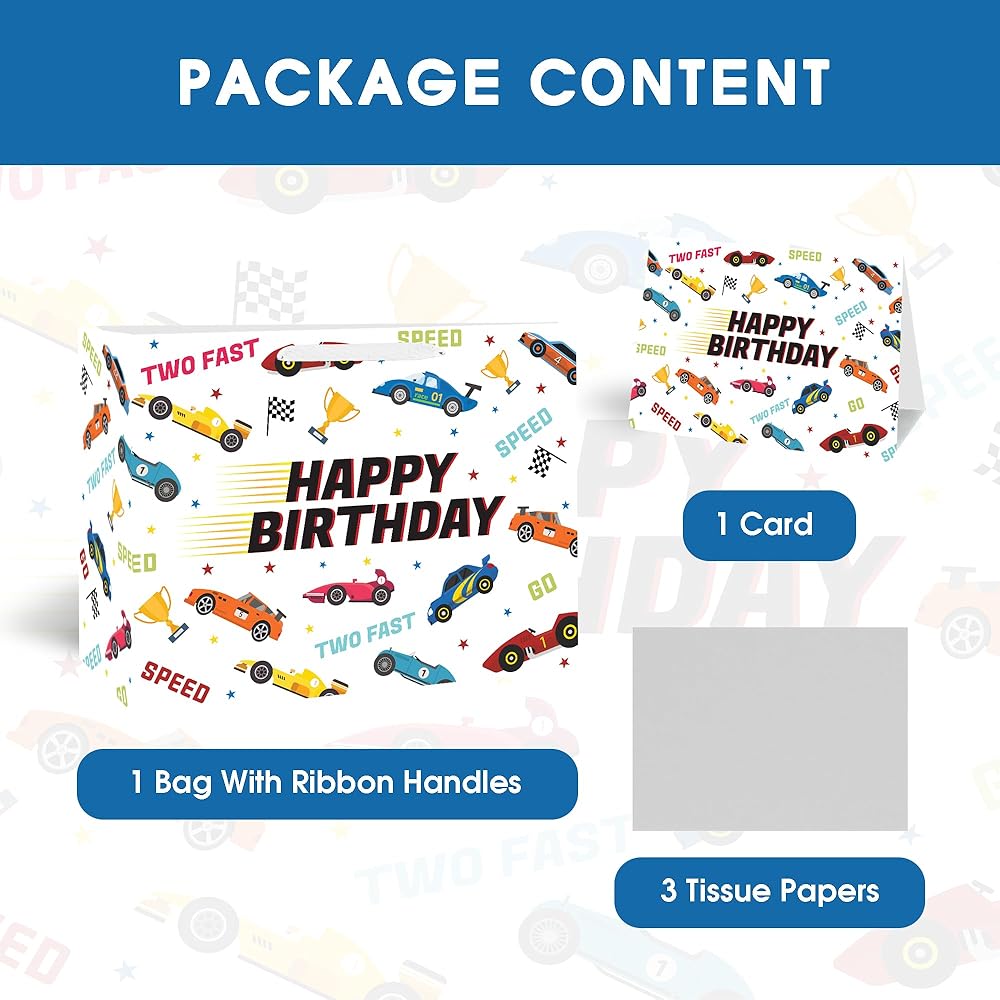 🎁 【VALUE PACKAGE】: This Birthday Gift Bag Includes one Race Car large gift bag, 3 sheets of White tissue paper, and a cute greeting card; which are perfect for the need of celebrating Birthday Parties, Kids' Birthday Parties and other special occasions for loved ones.