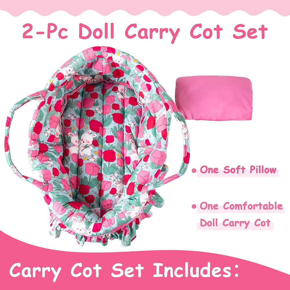 This lovely pink carry cot set provides convenience for children who want to take their dolls on outdoor activities, and includes a comfortable pillow for the doll's comfort.