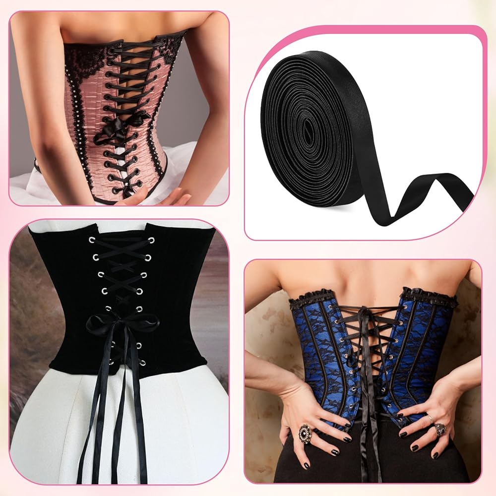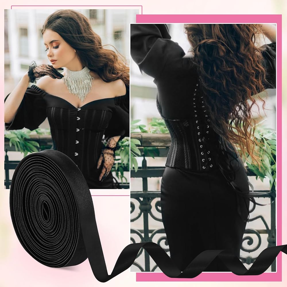 Feature: 393.7 Inches Wedding Dress Tie Back - 2 pcs Adjustable Satin Lace Up Corset Ribbon for Bridal Gowns, Dress Cord Back Corset Ribbon, Replacement Lacing Cord for Zippers & Buttons (Black, 10 Yards)