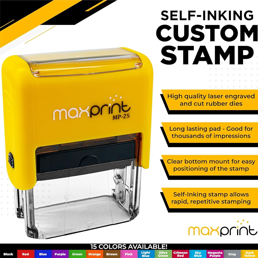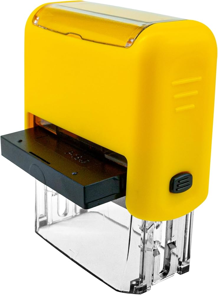Our Self-Inking Stamp is the perfect tool to streamline your repetitive tasks! This compact and efficient stamp features a built-in ink pad and an user-friendly design, simply press down for a crisp, clear impression every time. Customize the stamp with your personalized text making it ideal for addressing envelopes, marking documents, or adding a professional touch to your paperwork. Save time and effort with this reliable and durable self-inking stamp!