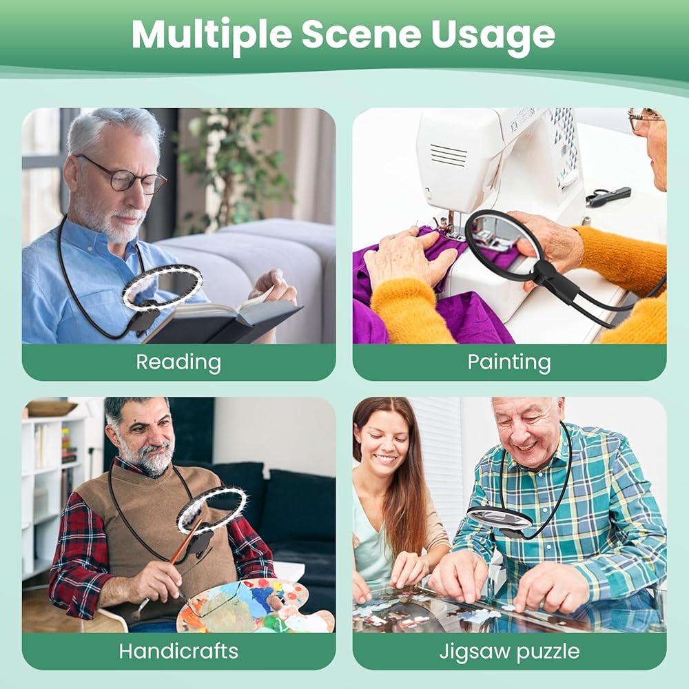 تصميم 3-in-1 متعدد الوظائف للاستخدام متعدد الاستخدامات: يدعم هذا المكبرات الخالية من الرقبة مع الضوء ثلاثة أوضاع للاستخدام: شنق حول الرقبة للتشغيل الخالي من اليدين ، أو الاستلقاء على طاولة للقراءة أو العمل المريحة ، أو الاحتفاظ بها يدويًا للتعامل المرن. إنه يتكيف دون عناء مع احتياجات مختلفة ، سواء للقراءة أو الإصلاحات المتقاطعة أو الدقة