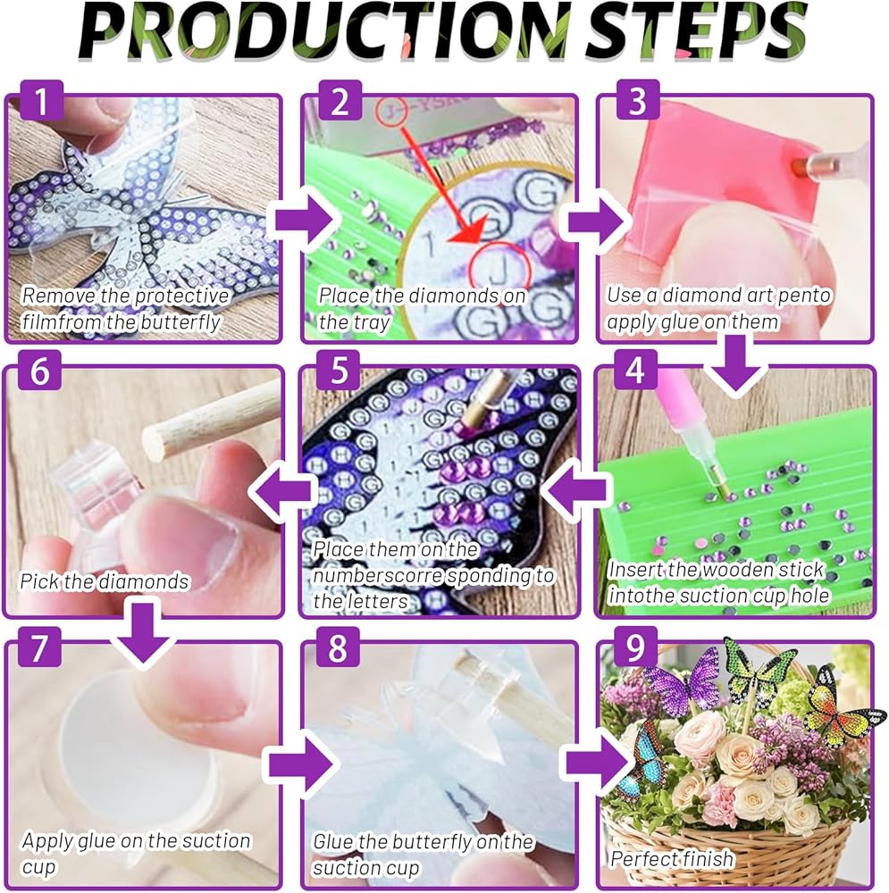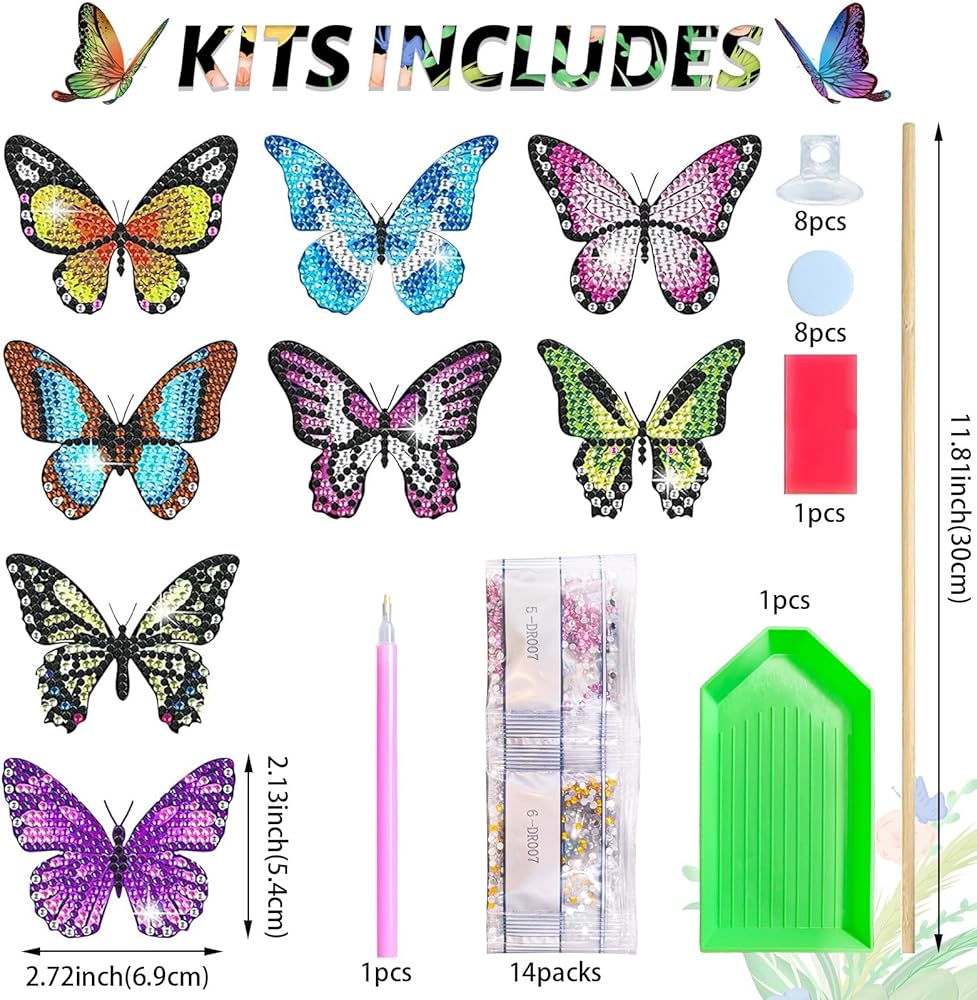 Complete DIY Kit: Includes 8 butterfly diamond paintings, 8 bamboo sticks (11.8 inches), 8 suction cups, 8 double-sided stickers, 1 diamond pen, 1 clay glue, and a sufficient number of diamond painting kits