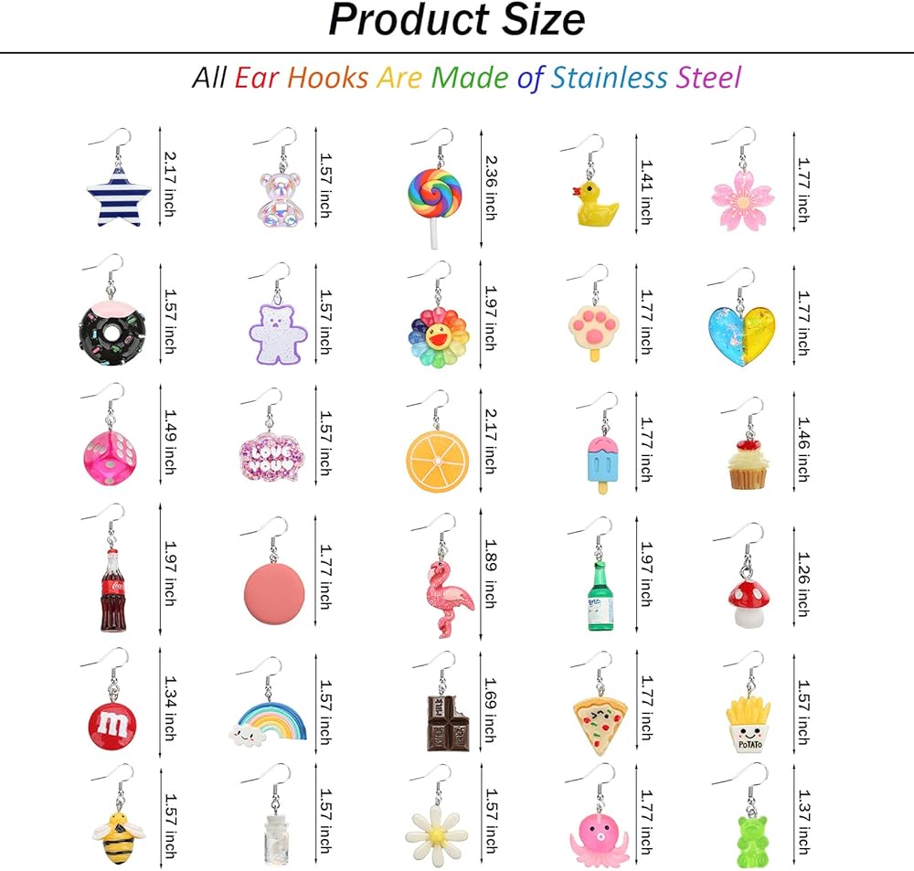 【مجموعة أقراط متدلية لطيفة】 سوف تحصل على 30 زوجًا من الأقراط غير التقليدية بما في ذلك أقراط البيتزا/أقراط المصاصة/أقراط الشوكولاتة/أقراط قوس قزح/أقراط النرد/أقراط الدب/أقراط الفطر/أقراط الكيك/أقراط فلامينجو وما إلى ذلك. يمكنك ارتداؤها في مناسبات مختلفة أو كدعائم للصور، مما يمنحك الكثير من المرح.