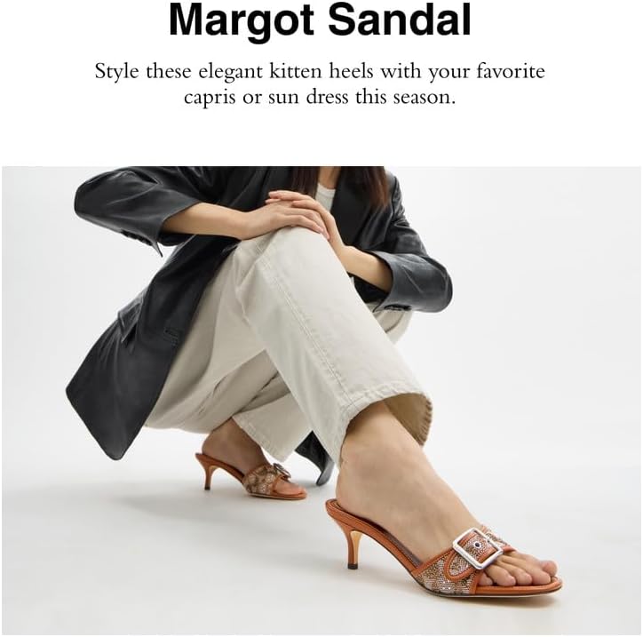 Easy to dress up or down, the Margot sandal is crafted of our Signature jacquard and leather. This slip-on design is finished with a polished buckle and a sculpted kitten heel. Signature jacquard and leather upper, man-made leather lining, leather footbed, leather outsole, slip on, 2 1/4" heel