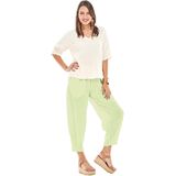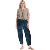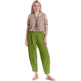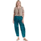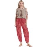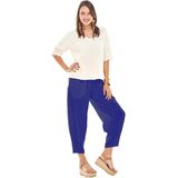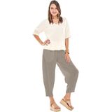 A shorter full cut cotton gauze pant with tapered (dart) hemline.
