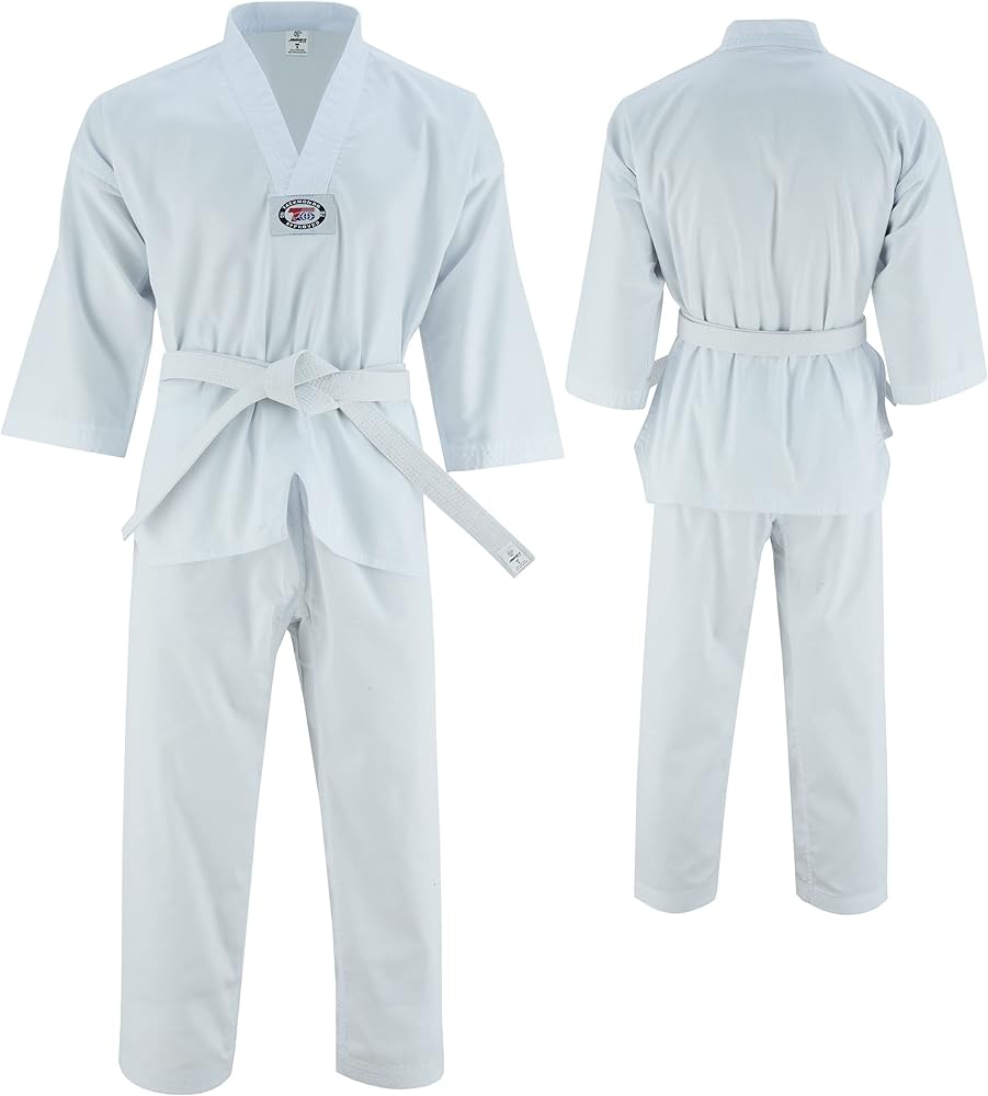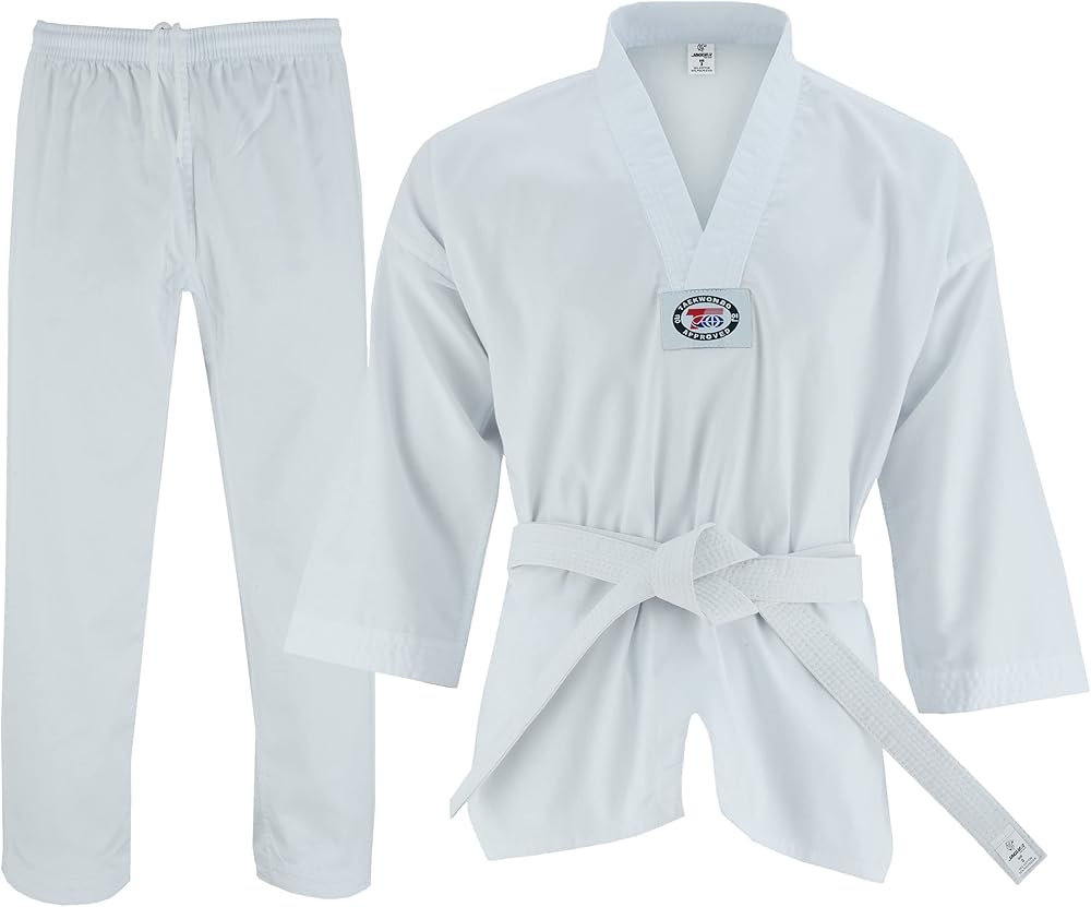 🐯 Jaguar Pro Gear's traditional Taekwondo uniform is constructed with Soft cotton-polyester blend, 8oz lightweight fabric, V-Neck, TKA logo, White belt included
