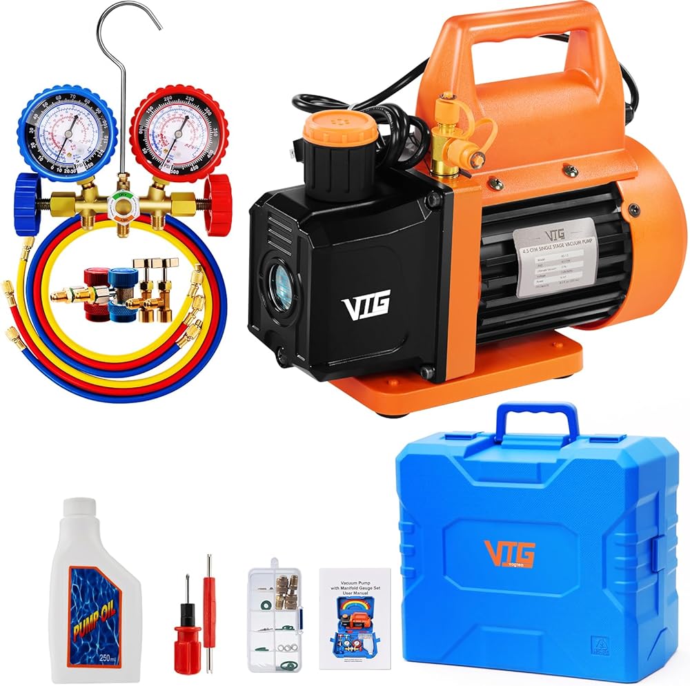 4.5 CFM AC Pump and Gauge Set ، لأنظمة الانقسام/HVAC/HVAC/AUTO ، مجموعة المقياس المتشعب المتوافقة مع R134A R12 R502 ، تشمل 3 خراطيم ، يمكن R134A النقر ، حالة تخزين ثلاثي ترقية ،