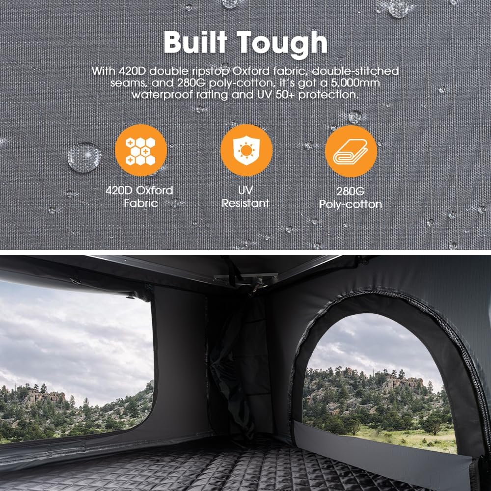 Lightweight, Tough, Ready: Crafted from ABS anti-aging polymer, this 11.4 inches low-profile shell cuts down wind drag for smoother travels. With 420D double ripstop Oxford fabric, double-stitched seams, and 280G poly-cotton, it's 5,000mm waterproof and UV 50+ protected. Just release the buckle and give it a gentle push, the four seamless gas struts inside ensure added stability for your adventures.