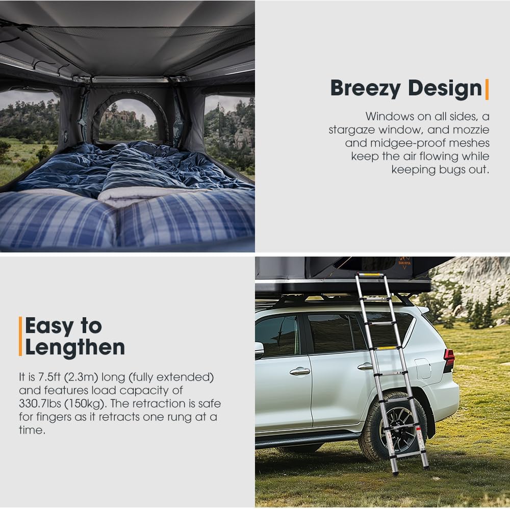 Spacious Comfort: At 82.7 x 48.4 x 37.4 in, this isn't just any rooftop tent—it's your cozy home away from home! And when it's time to sleep, the plush 2 inches cloud foam mattress with an anti-condensation mat ensures you wake up feeling energized! Windows on all four sides, with mozzie and midgee-proof meshes and canvas doors so you can adjust for any weather conditions.