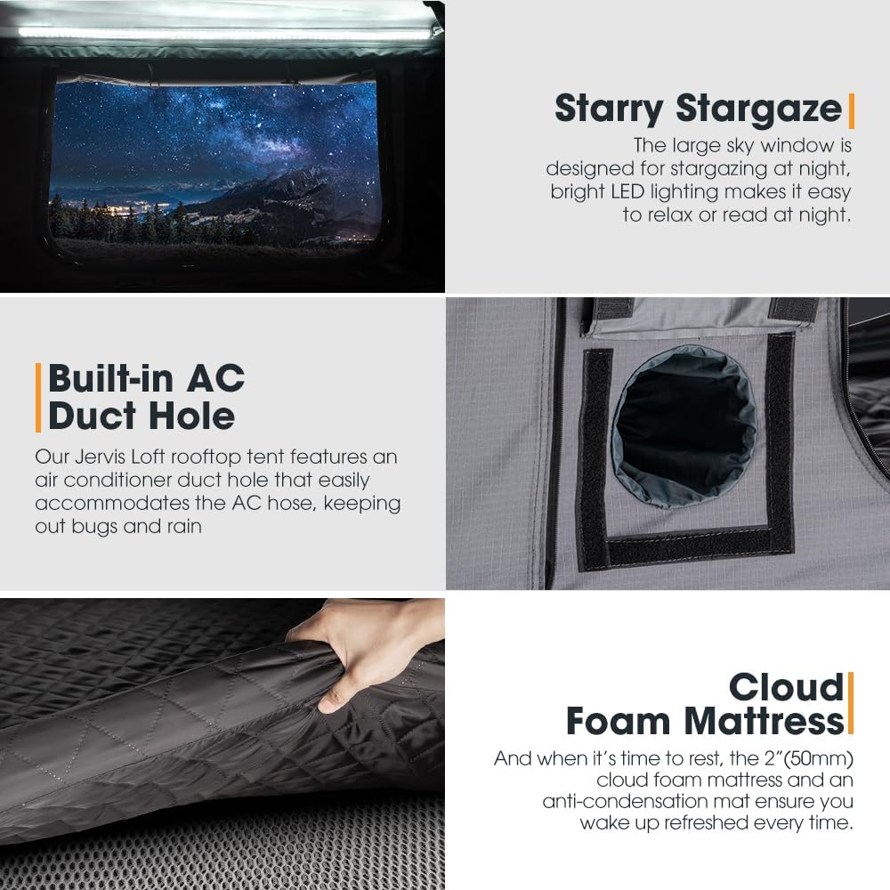 Built-in AC Duct Hole: Our Jervis Loft rooftop tent comes with a built-in air conditioner duct hole, making it a breeze to connect your AC hose. This means you can enjoy a refreshing breeze inside while keeping those pesky bugs and rain at bay. Sleep tight, and stay cool wherever you camp! Enjoy the perfect temperature and a peaceful night's sleep, no matter where your adventures take you!