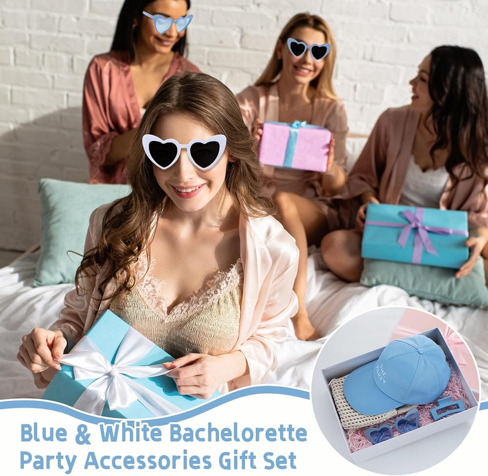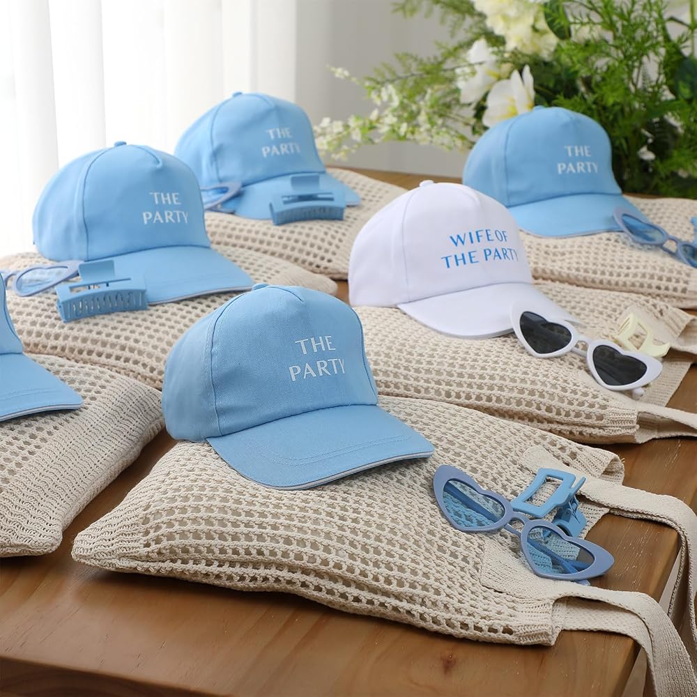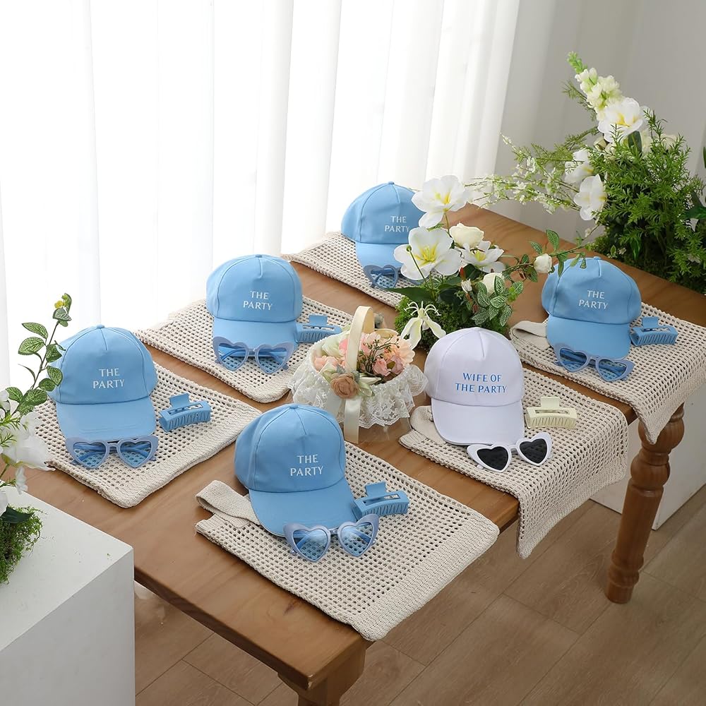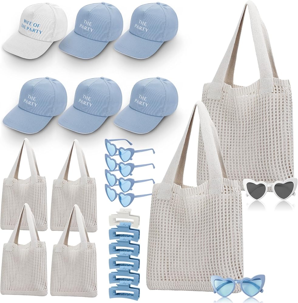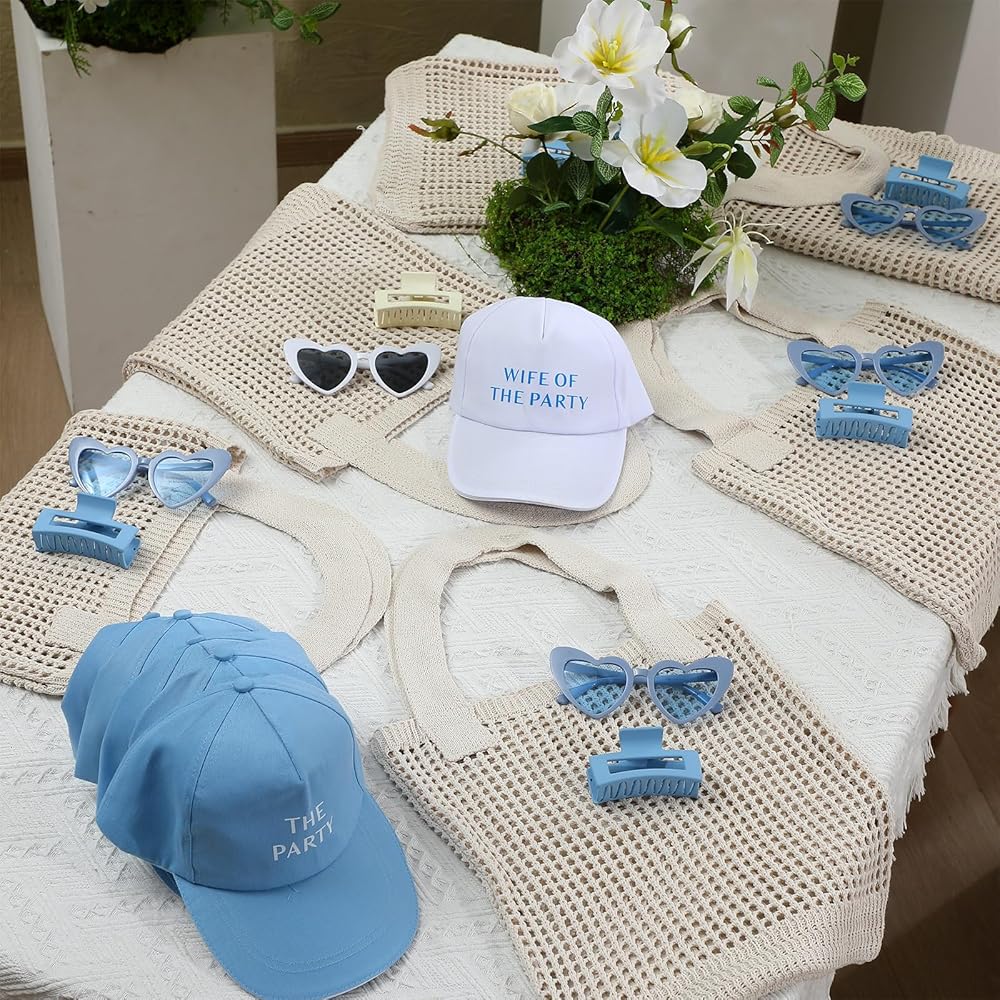 This blue accessories party gift set combines coordinated hats, claw clips, crochet tote bags, and sunglasses to provide a complete accessory solution for the bride and her party, making group celebrations more unified, stylish, and memorable without the need for extra shopping or planning.