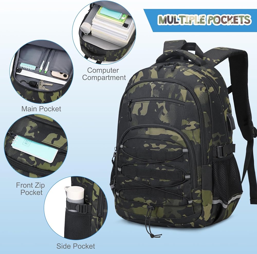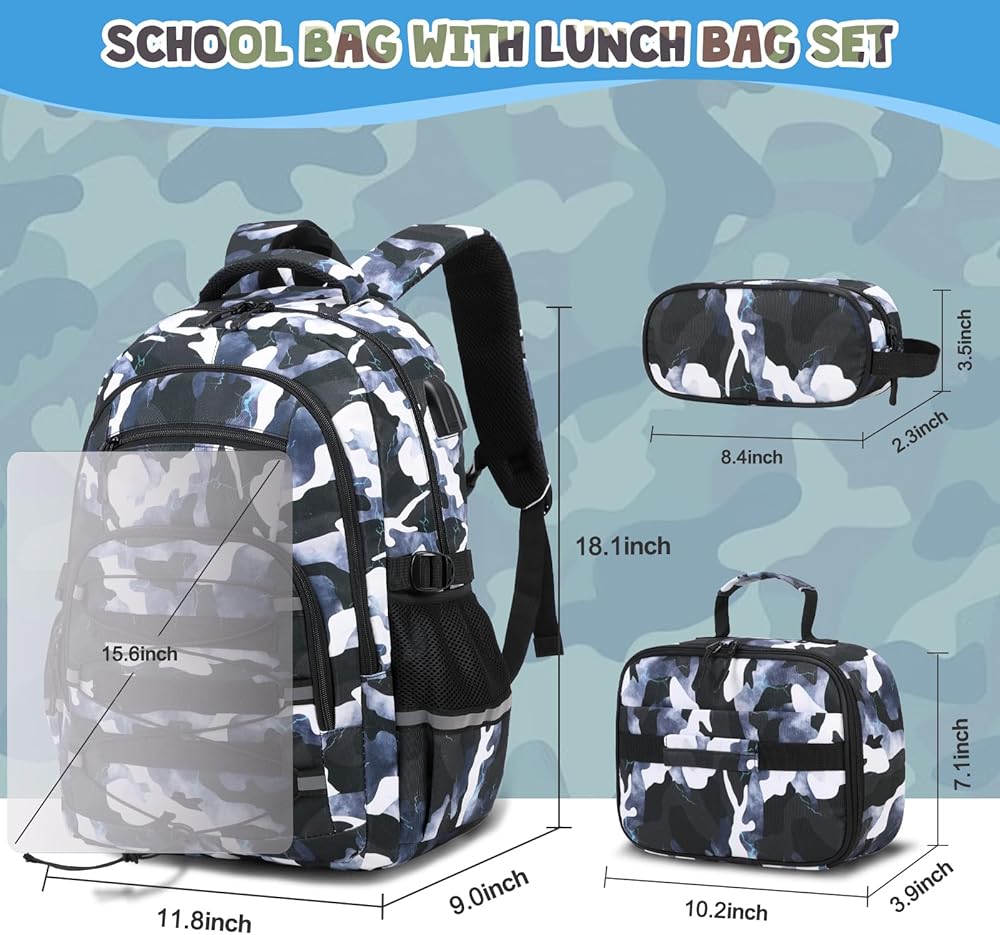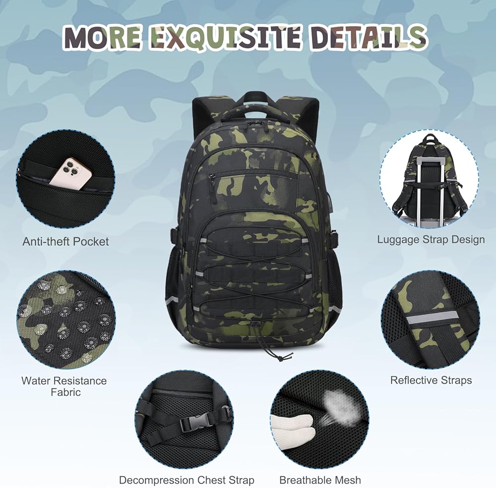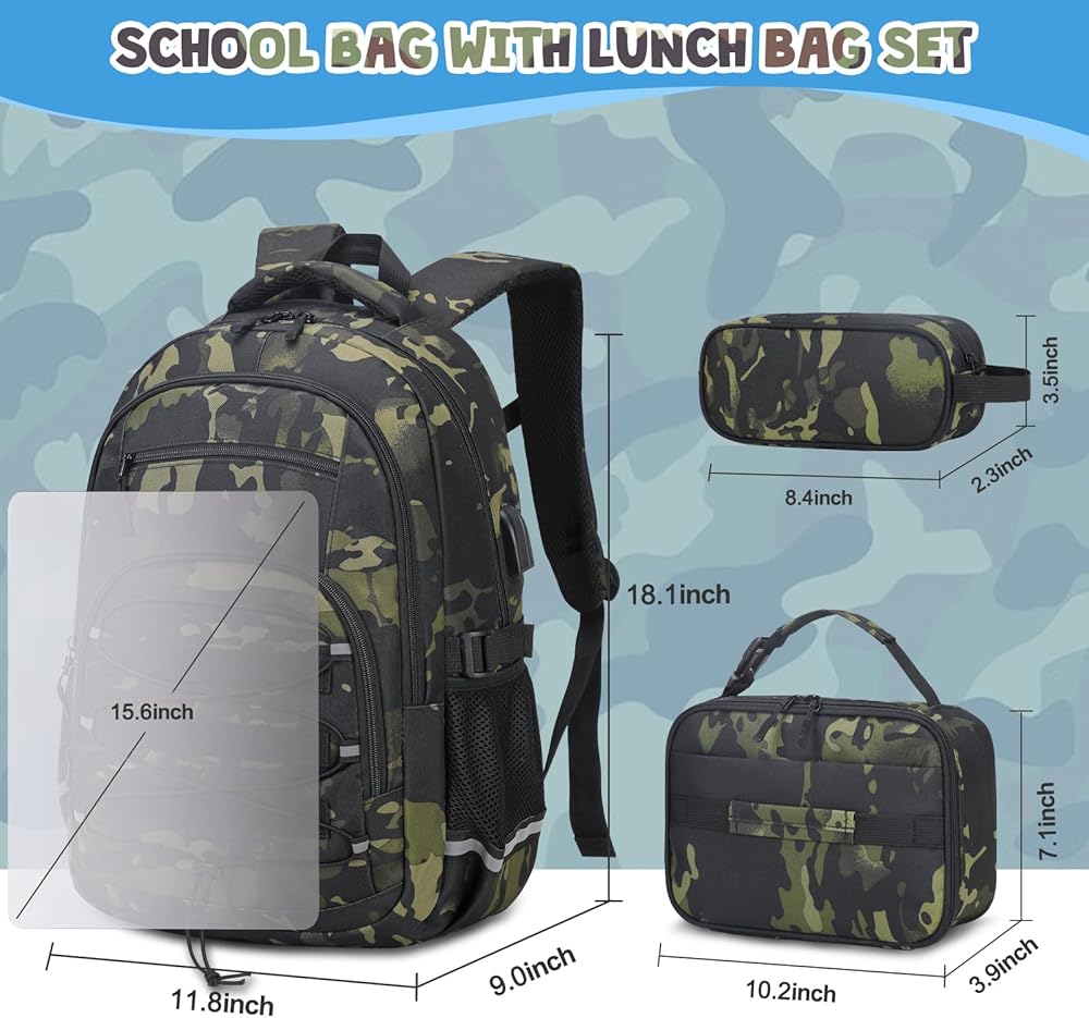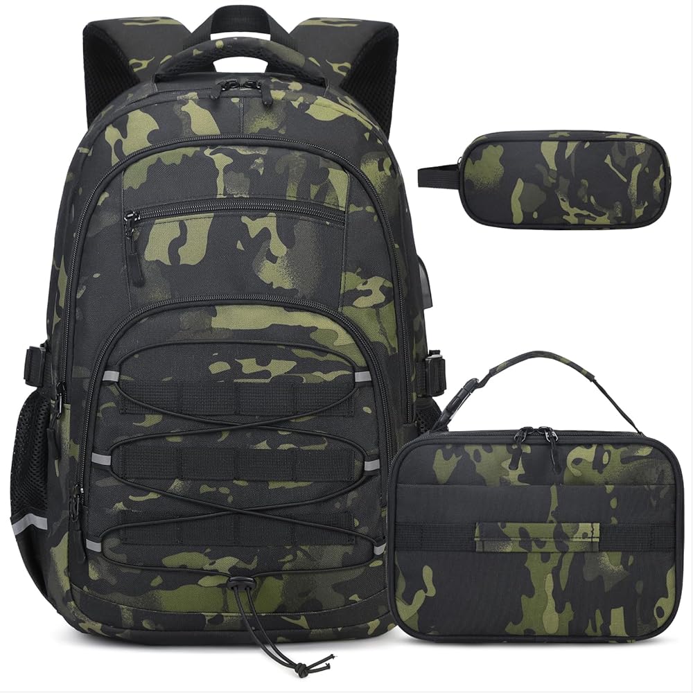 حقيبة ظهر كامو للأولاد ، أولاد الظهر تكتيكي الأطفال ، وأكياس المدارس للأطفال المراهقين المراهقين الأطفال الابتدائية في المدرسة الثانوية ، وحقيبة الكتب العسكرية وحالة قلم رصاص الغداء مع ميناء شحن USB