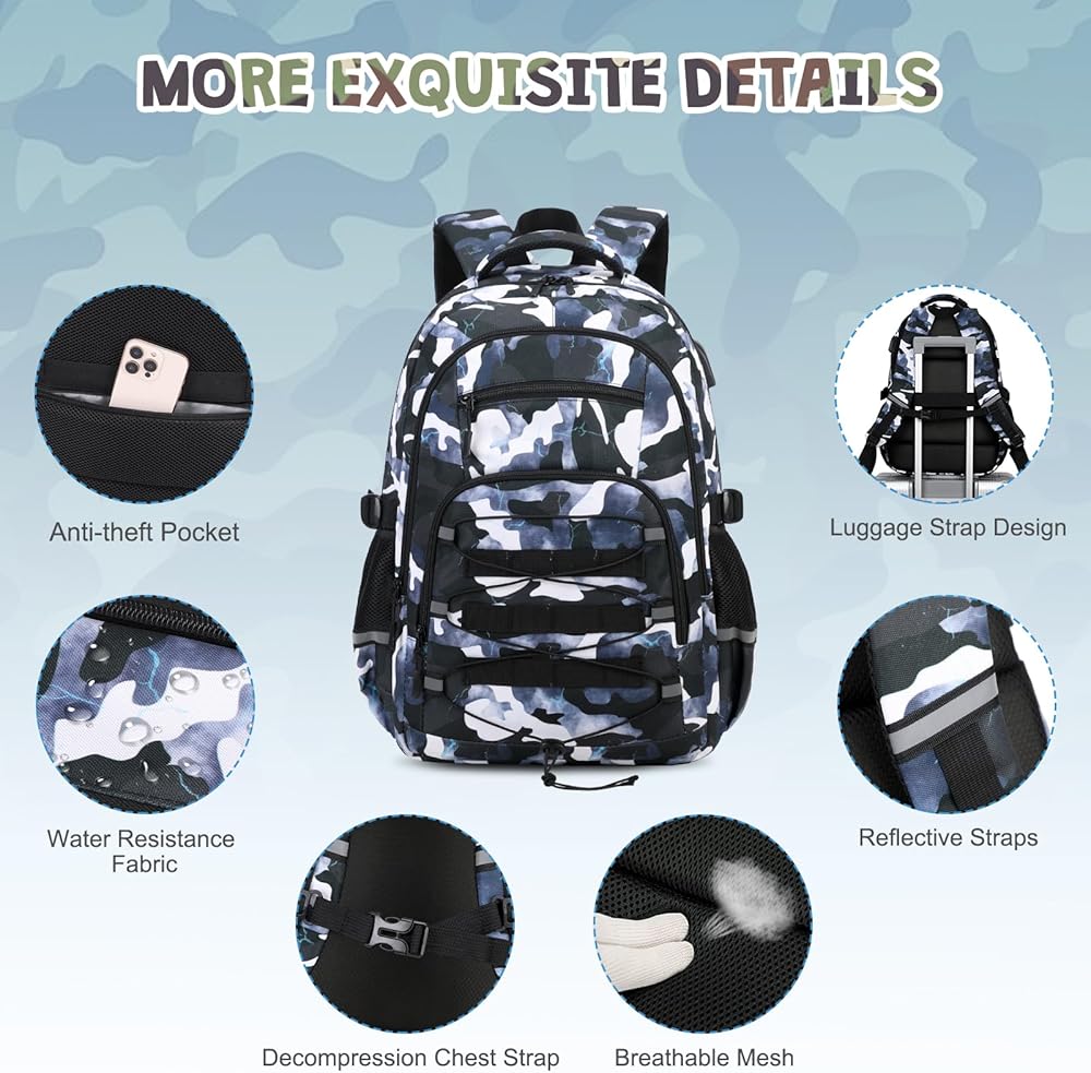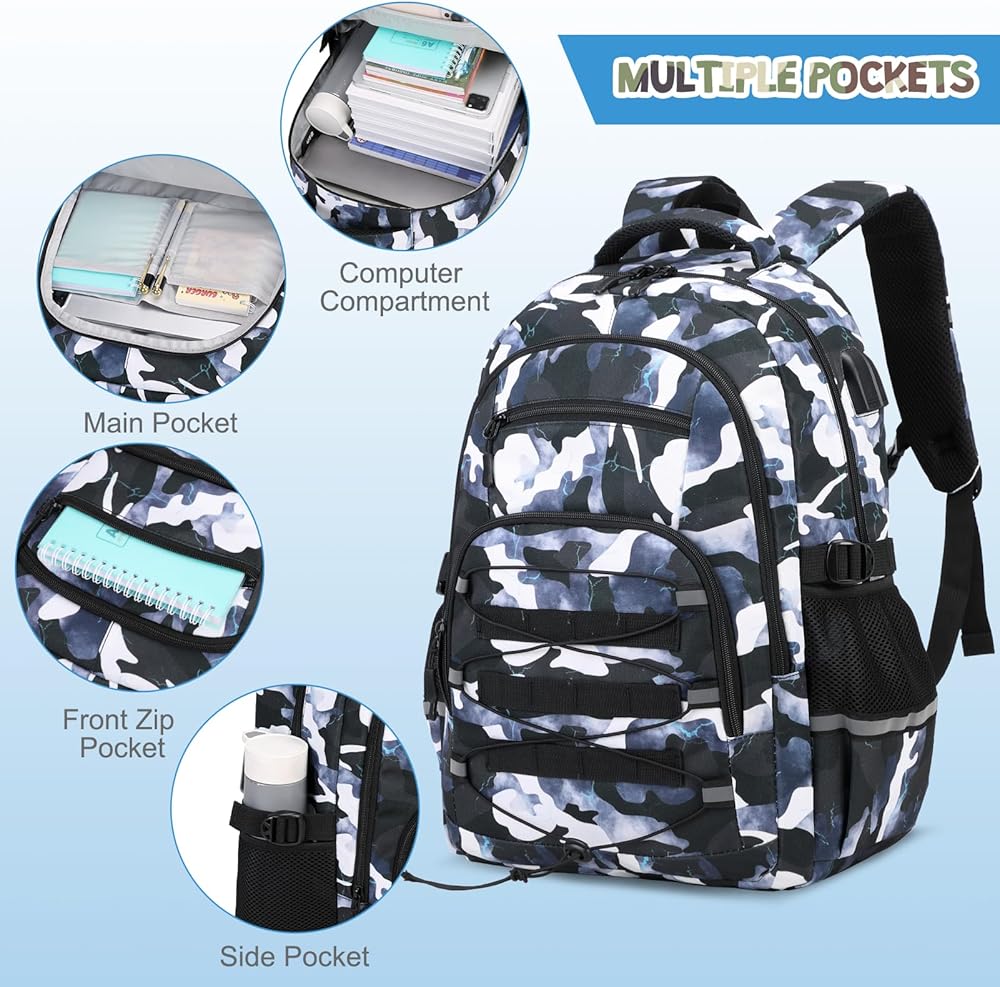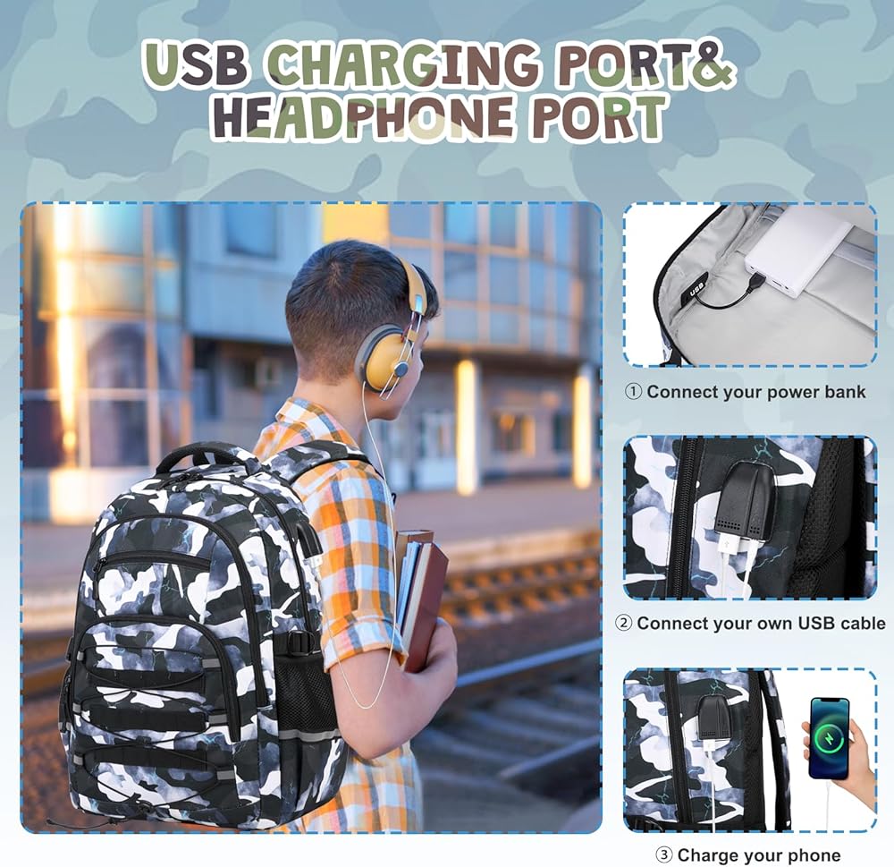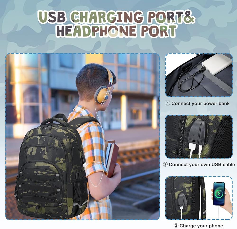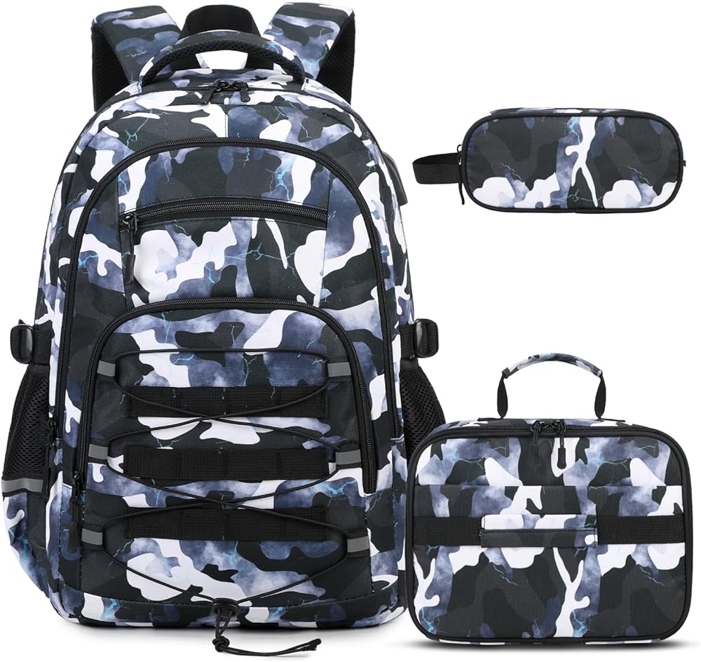 حقيبة ظهر كامو للأولاد ، أولاد الظهر تكتيكي الأطفال ، وأكياس المدارس للأطفال المراهقين المراهقين الأطفال الابتدائية في المدرسة الثانوية ، وحقيبة الكتب العسكرية وحالة قلم رصاص الغداء مع ميناء شحن USB