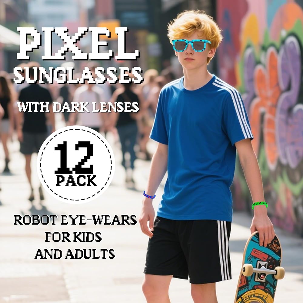 24PCS Pixel Party Forms Favors ، 12 زوجًا من نظارة شمسية مصنوعة من البكسل و 12 أساور السيليكون ، هدية ألعاب الفيديو للأطفال والبالغين لوازم حفلات عيد ميلاد البالغين