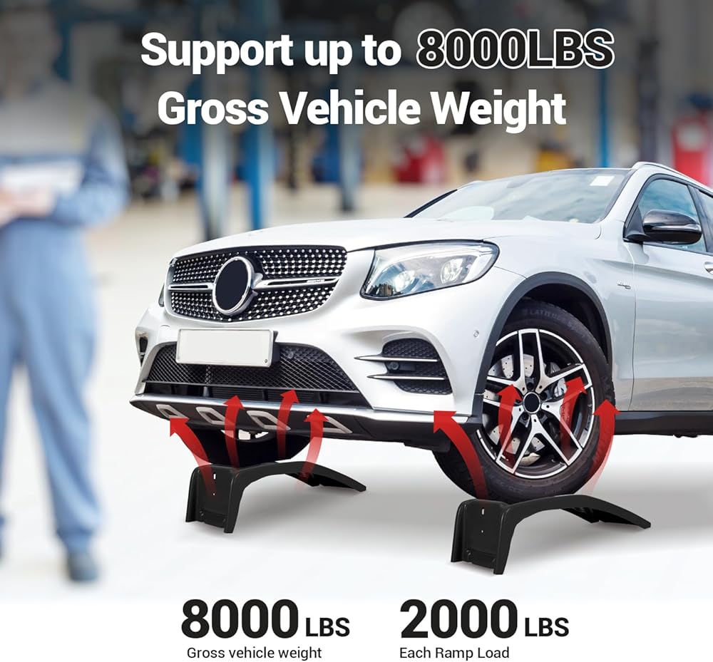 • 8,000 lb Weight Capacity: Engineered to safely support vehicles up to 8,000 lbs (2,000 lbs per ramp), these professional-grade steel ramps provide a stable platform for both DIY enthusiasts and mechanics performing maintenance or repairs.
