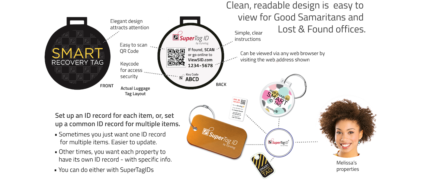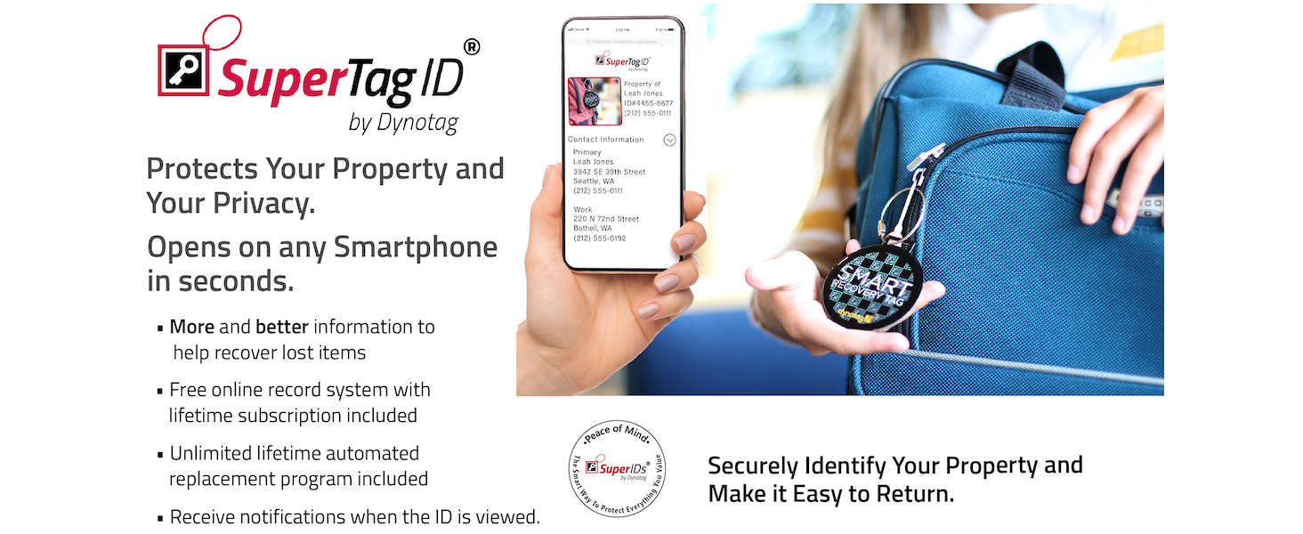 راحة البال: كن مستعدًا لحالات الطوارئ! حماية ضد سرقة الهوية! حماية مدى الحياة لأحبائك والمعدات القيمة! يتم تركيبه بشكل آمن في دقيقة واحدة، ويحمي مدى الحياة! سوف تتساءل كيف كنت تعيش بدونها! تعرض العلامة جهة الاتصال والمعلومات الأخرى التي قمت بإعدادها. يتصل المشاهدون بك أو بفريق الدعم لدينا لترتيب العلاج! مع وجود مئات الآلاف من العلامات في الخدمة، تعد Dynotag الشركة الرائدة في توفير العلامات الذكية التي لا تحتاج إلى صيانة ولها مكاتب في الولايات المتحدة وكندا وأوروبا.