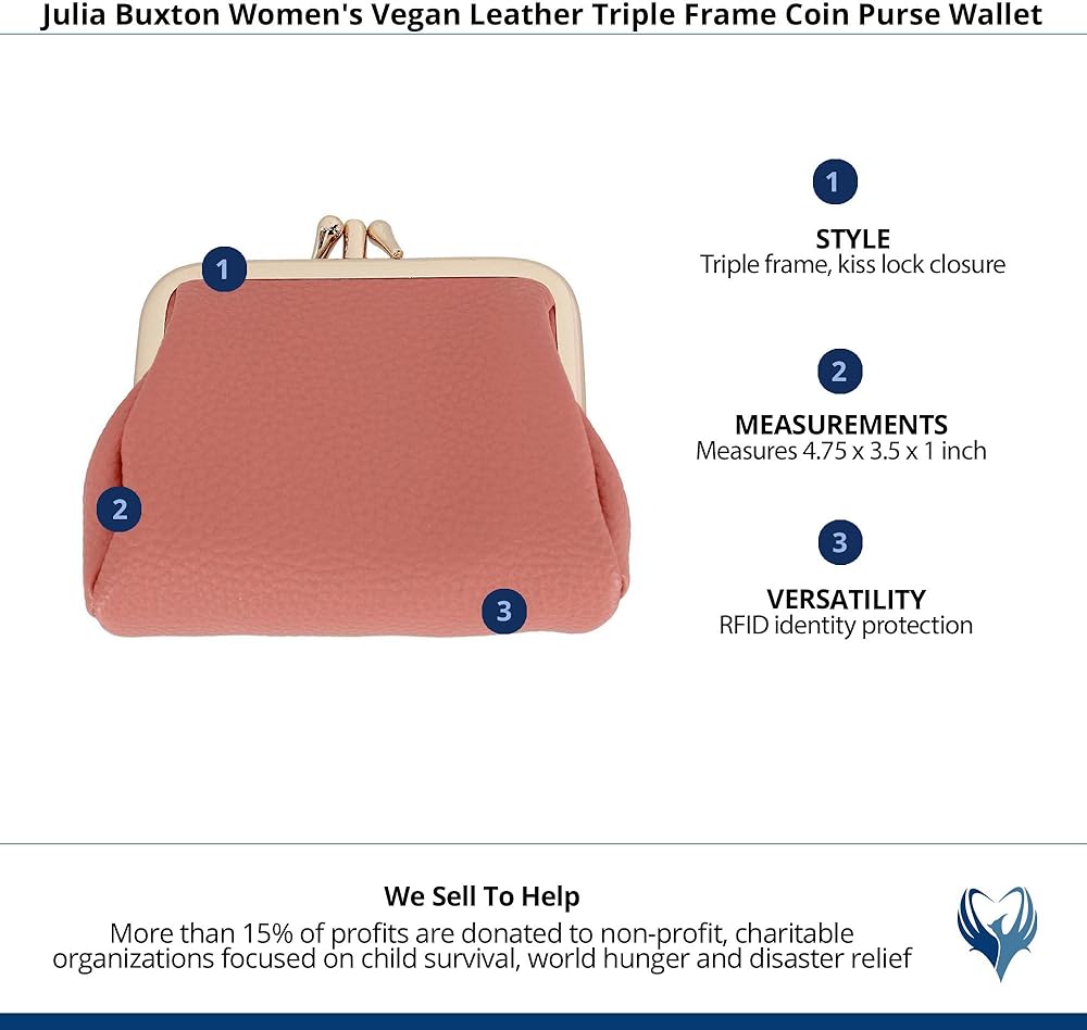 This triple frame coin purse wallet is the perfect size for carrying essentials. With the unique triple frame, this wallet offers two individual compartments for change, small bills, and receipts.. This coin purse wallet is a great grab-and-go style for your cash, coins, cards, and more. The wallet offers RFID protection to keep your wallet safe as can be. With the pebble grain texture, triple frame, and kiss lock closure, this wallet makes a wonderful gift. Available in many colors and prints, youll want them all!