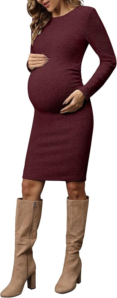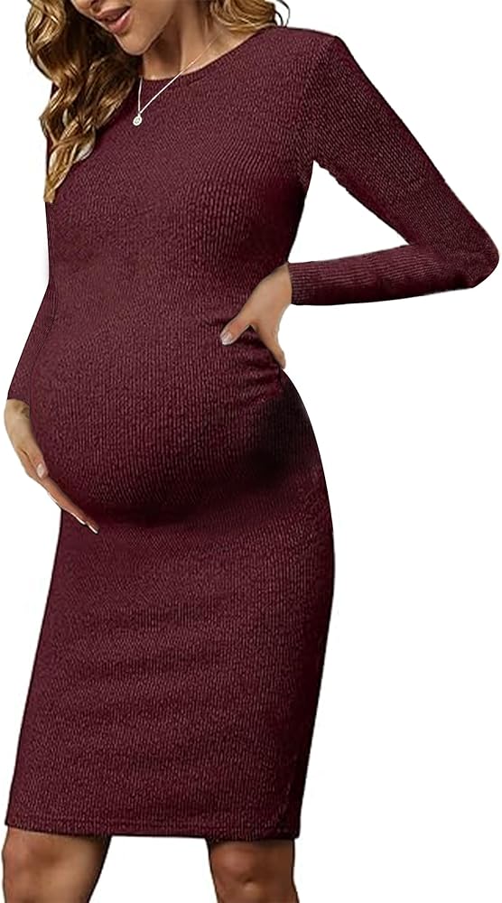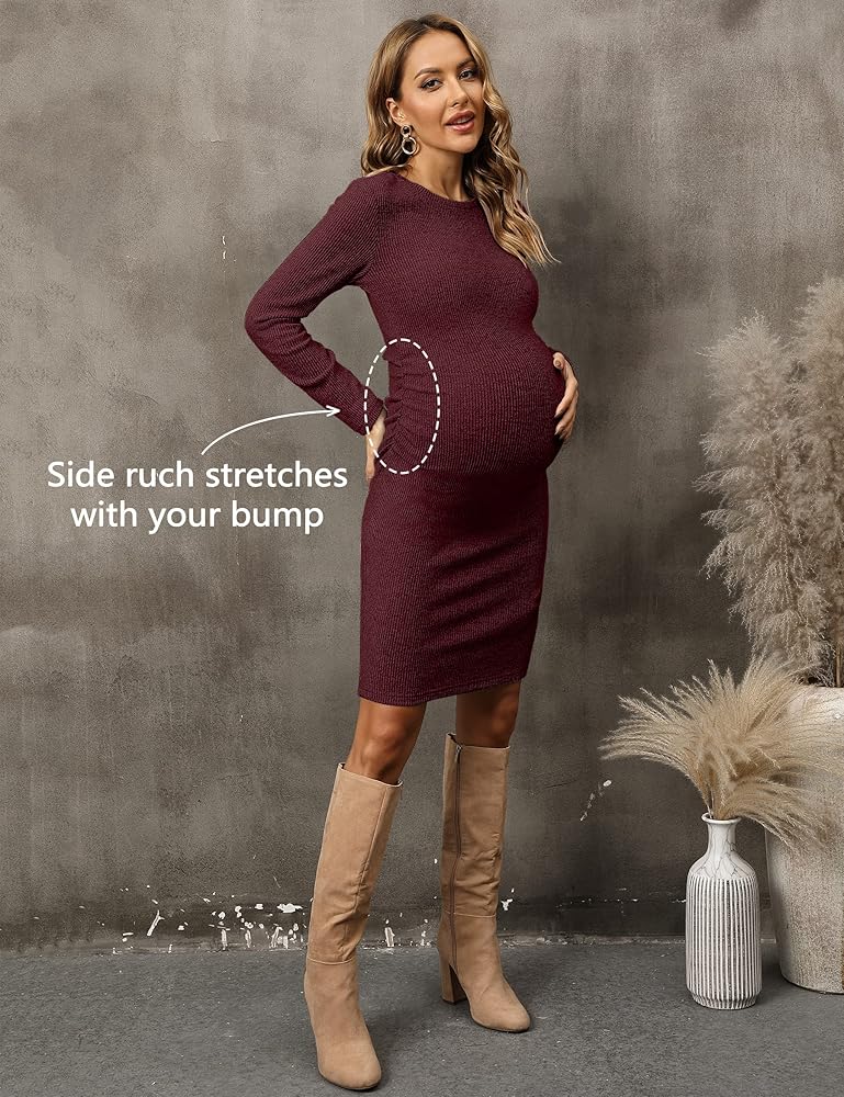 [Side Ruch] نسيج مضلع، مناسب للشكل، بطول الركبة. تمتد الكشكشة الجانبية إلى الأعلى لاستيعاب بطنك الحامل وتمنحك الشكل في جميع الأماكن الصحيحة. فستان الحمل هذا سهل الارتداء ويحتضن منحنياتك.