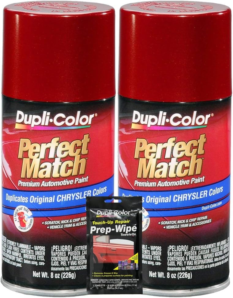 This bundle comes with 2 - Dupli-Color (BCC0412) Inferno Red Metallic Chrysler Perfect Match Automotive Paint - 8 oz. - Dupli-Color Perfect Match Premium Automotive Paint is an easy-to-use, high-quality, fast-drying, acrylic lacquer aerosol paint specially formulated to exactly match the color of the original factory applied coating. Ideal for use on all OEM paint surfaces, Perfect Match is available in a complete line of exact-match colors for current and late model import and domestic vehicles, making this product ideal for both small scale vehicle touch-up and for painting vehicle accessories. For the final step in the exact color match process and to provide additional gloss and protection, finish with Dupli-Color Perfect Match Clear Coat. Plus comes with 1 Dupli-Color Prep-Wipe Towelette, specially formulated to remove oil, wax, grease, and other contaminants from the surface. A must for any paint project because it cleans and prepares the surface for painting.