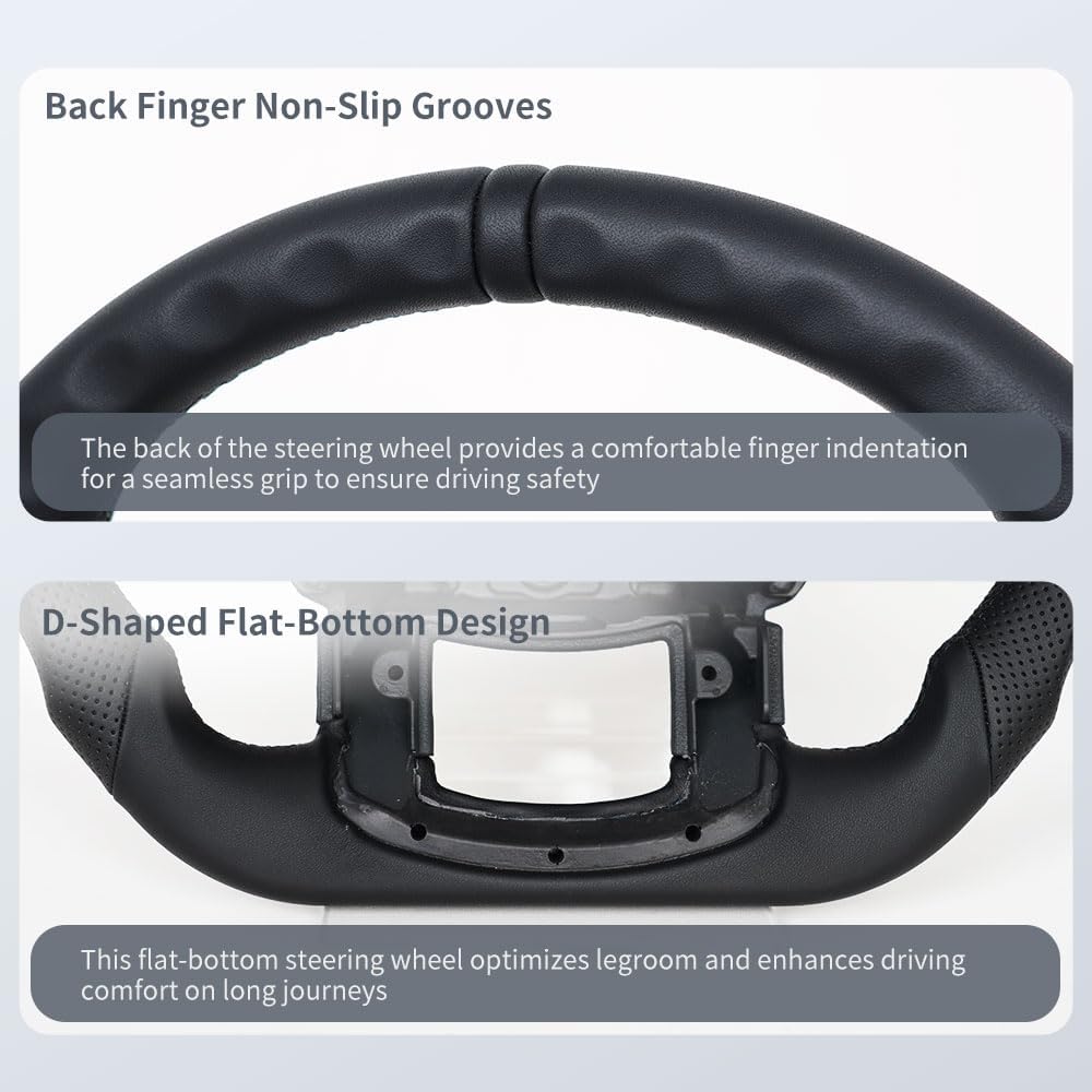 عجلة القيادة الجلدية الكاملة: يمكن استخدام عجلة القيادة هذه من الجلد عالي الجودة ، ويمكن استخدامها لفترة طويلة دون تقشير. يحسن التصميم السفلي على شكل D مساحة الأرجل ويعزز الراحة في الرحلات الطويلة
